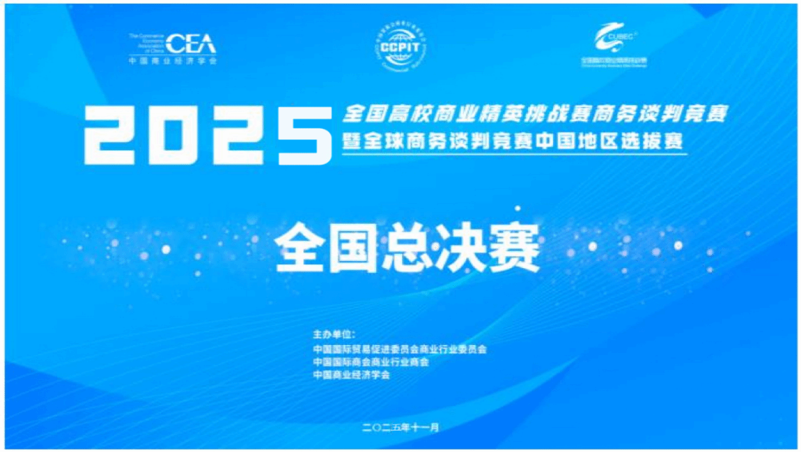2025年全国高校商业精英挑战赛商务谈判竞赛全国总决赛暨全球商务谈判竞赛中国地区选拔赛于2025年11月2日圆满落下帷幕。我院国际经济与贸易专业学生团队荣获全国一等奖的佳绩!