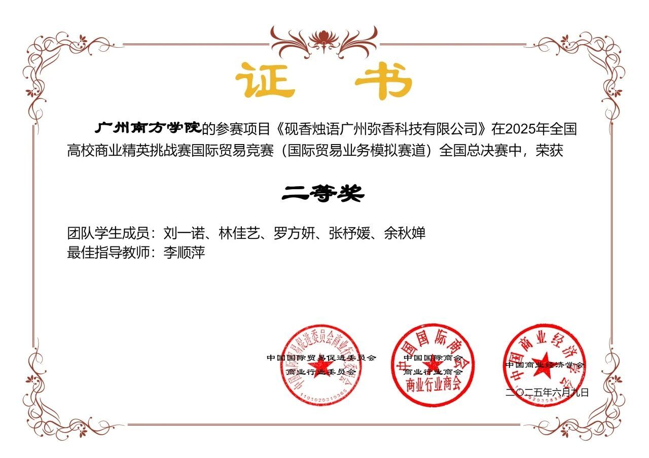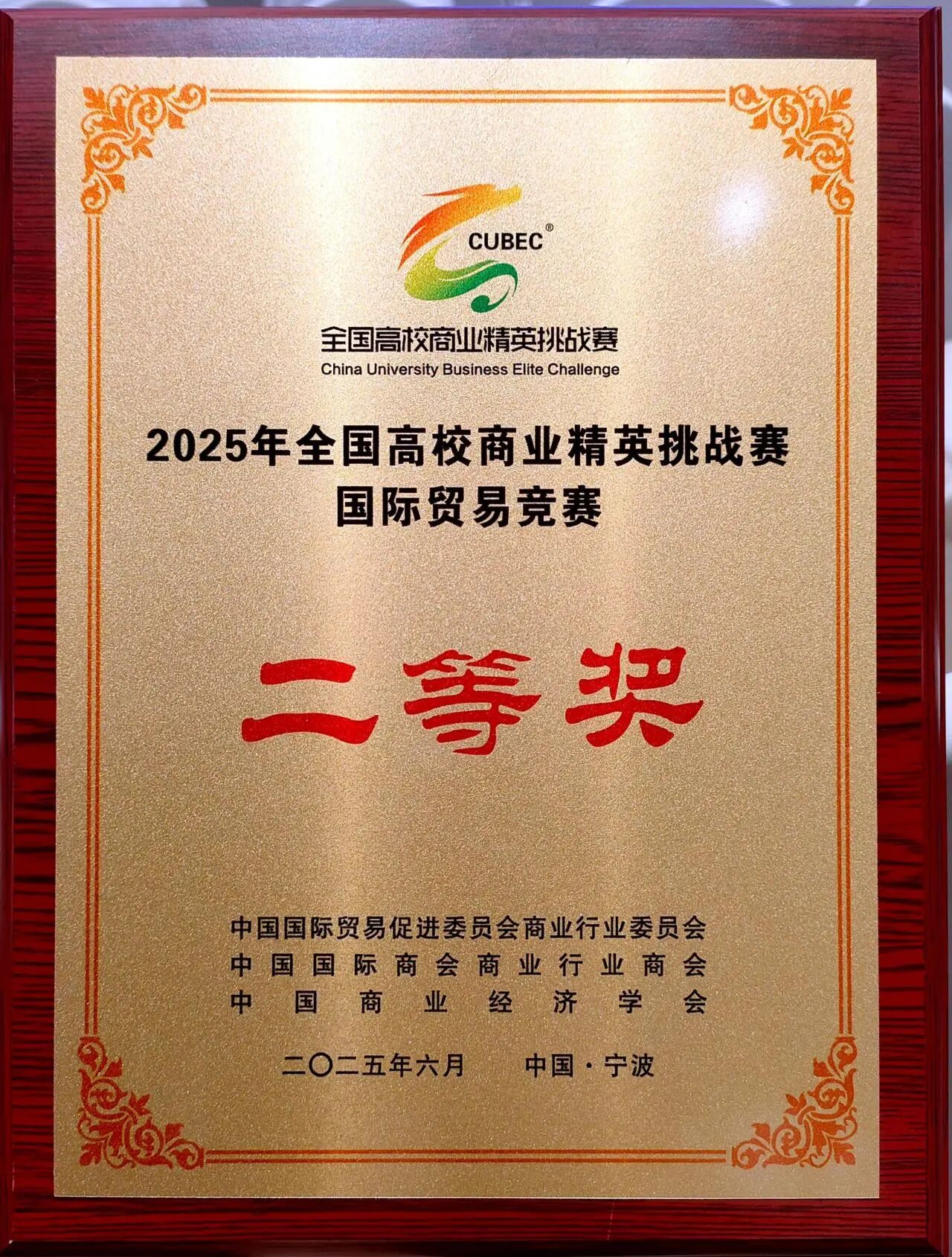 2025年6月4日至10日,我院学子赴浙江宁波参加全国高校商业精英挑战赛国际贸易竞赛(国际贸易业务模拟赛道)总决赛,经过激烈角逐,最终荣获全国二等奖!本次大赛由中国贸促会商业行业委员会等机构联合主办,吸引全国26个省市区198所高校、超3300名师生参与,我院团队以扎实的实践能力和顽强的拼搏精神,在408支参赛队伍中脱颖而出,为学院争得荣誉!