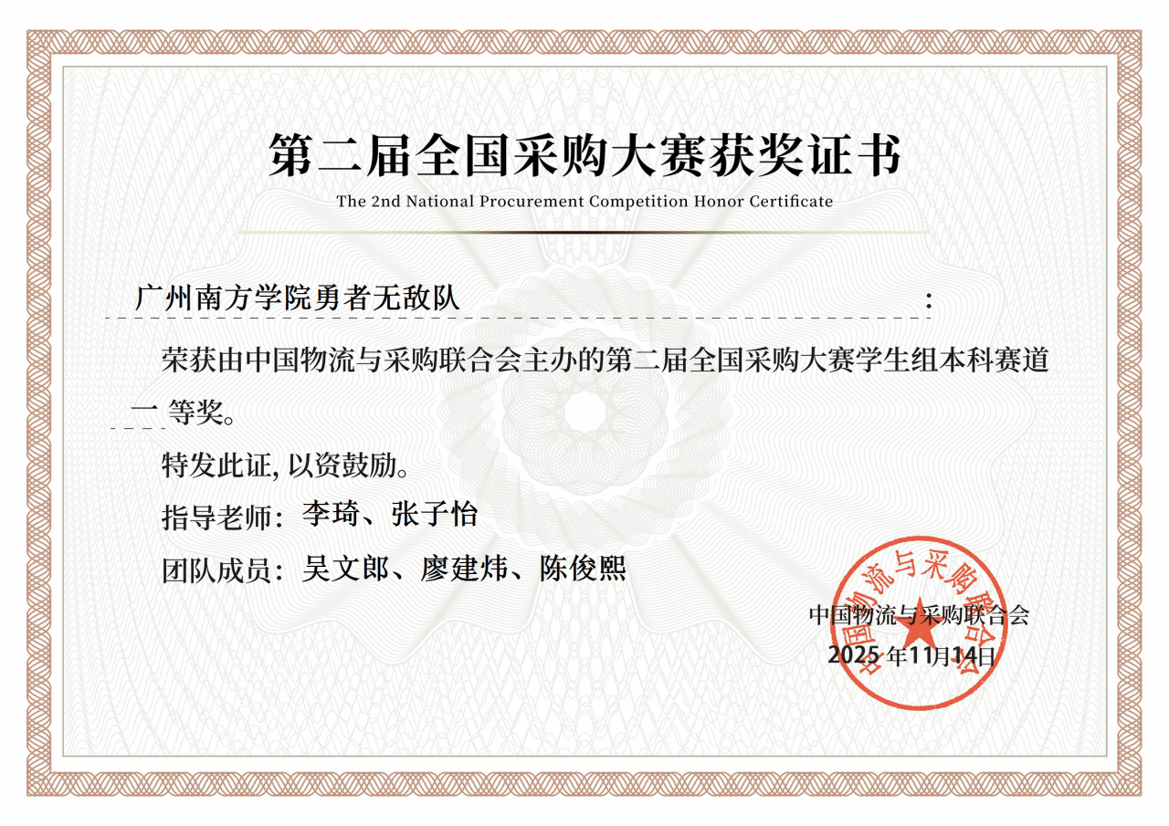 经过为期3个多月的激烈角逐,由中国物流与采购联合会主办的第二届全国采购大赛圆满收官,来自全国物流供应链行业相关单位的职工组和高校物流相关专业的学生组,120支晋级团队在总决赛竞争最终名次。williamhill中文组建的勇者无敌队——来自物流管理专业的吴文郎、陈俊熙、廖建炜同学和指导老师李琦、张子怡团队在阶段考核和总决赛中以黑马之势从理论考核到实战模拟,团体演练、复盘配合默契,最终实战过关评分位列总决赛小组第一名,勇夺学生组-本科赛道一等奖。