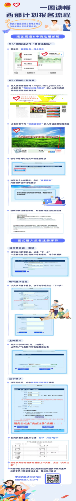 3月31日12:00起至5月中下旬,2024年普通高等学校应届毕业生或在读研究生,可通过微信公众号“西部志愿汇”(菜单栏中的“我要报名”)或登录西部计划官方网站(http://xibu.youth.cn),在西部计划报名系统中进行注册报名。