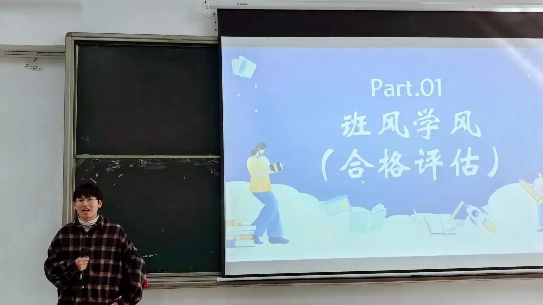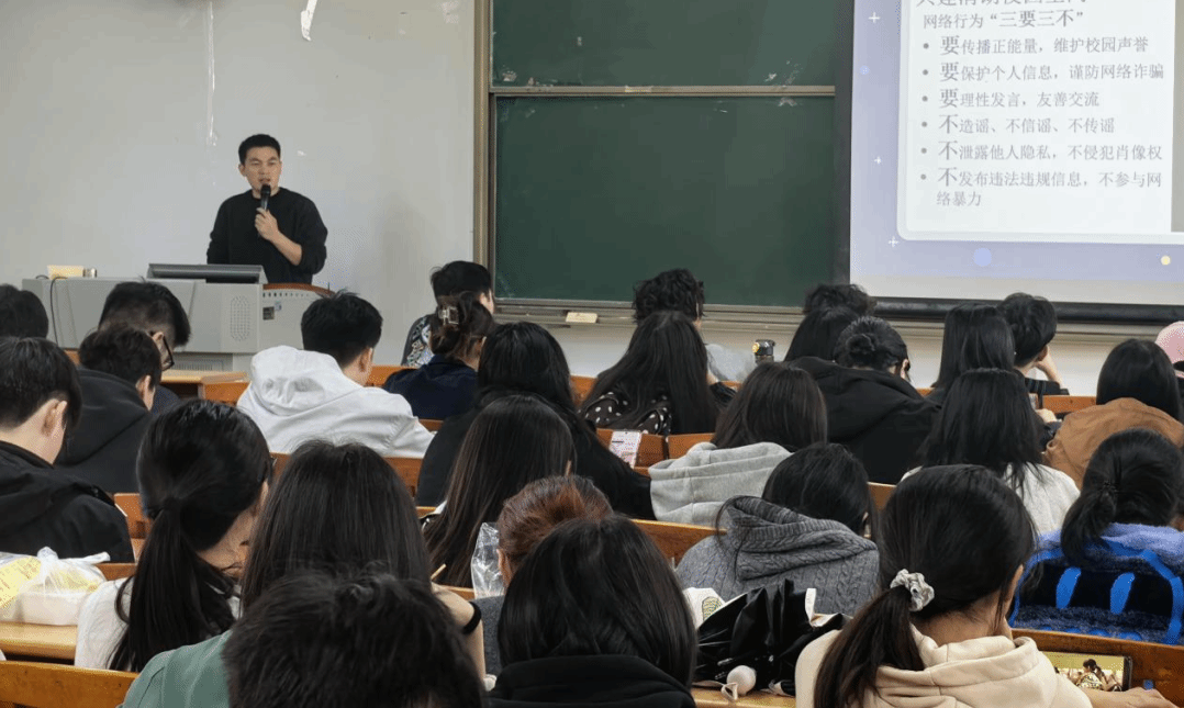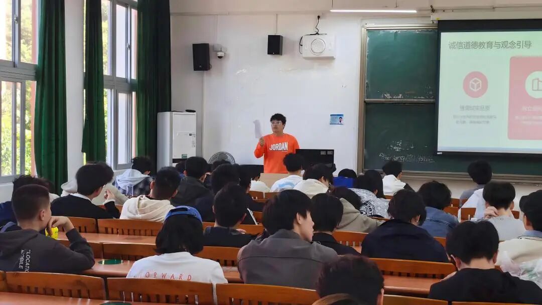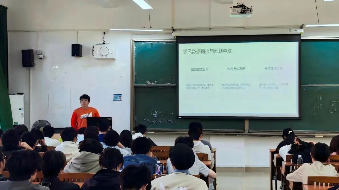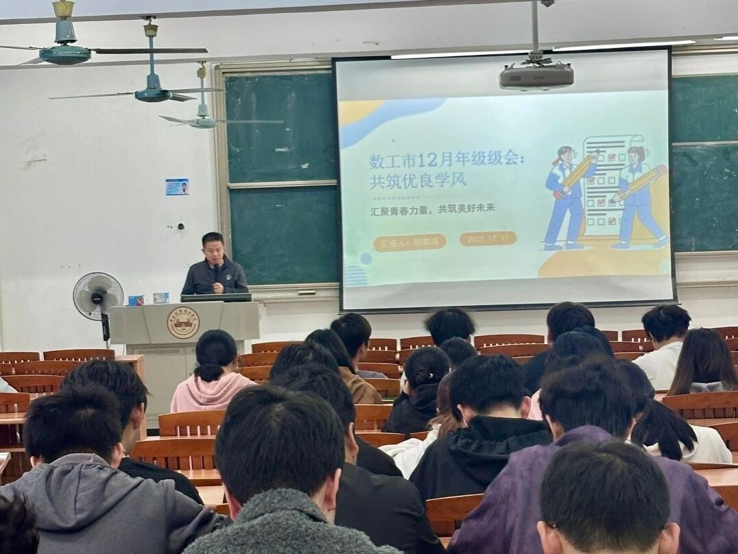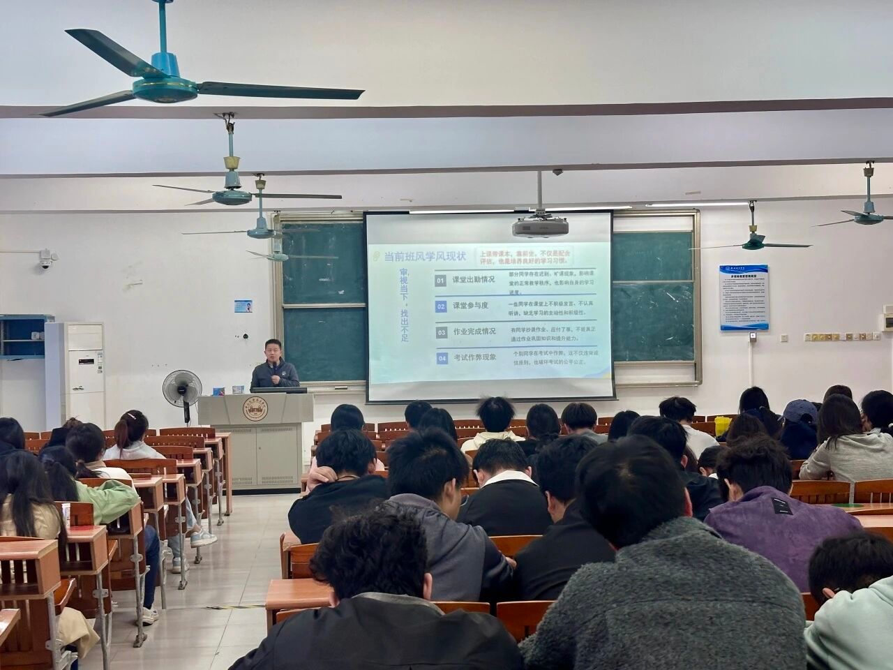 24级各班级紧扣班风学风建设、网络文明规范、诚信考试三大主题,结合专业特点与班级特色,于12月分别召开主题班会。其中,市场营销、工商管理等专业于12月17日召开年级大会,由辅导员胡敬成主持,引导学生从“上课带课本、尽量靠前坐”等细节入手,夯实学风基础。