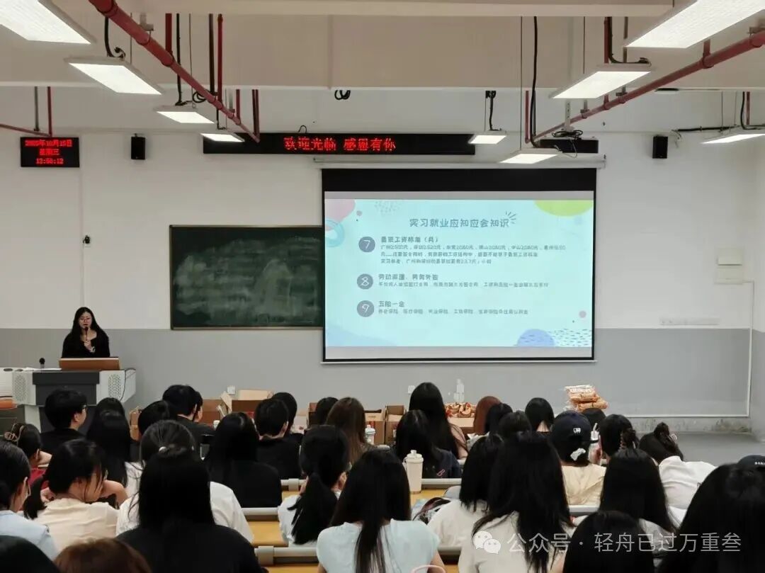 为帮助同学们从“校园人”平稳过渡为“职场人”,黄老师向同学们发出实习动员,希望大家积极行动,在实践中探索职业方向。并从实习时间、实习要求、安全注意事项以及实习期间需要完成的任务等多个方面,介绍了关于毕业生实习的具体安排。黄老师还分享了“求职应知应会”知识,重点强调求职和实习中的关键权益和注意事项,方便学生快速掌握实用信息。