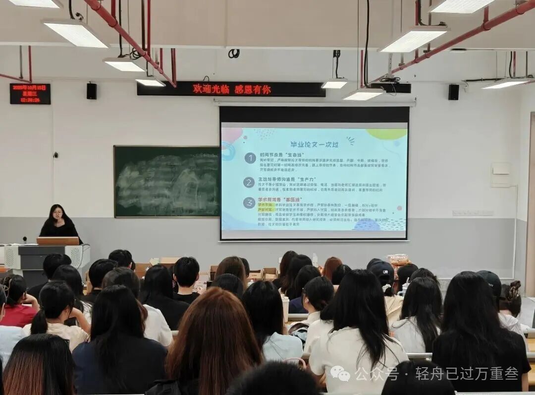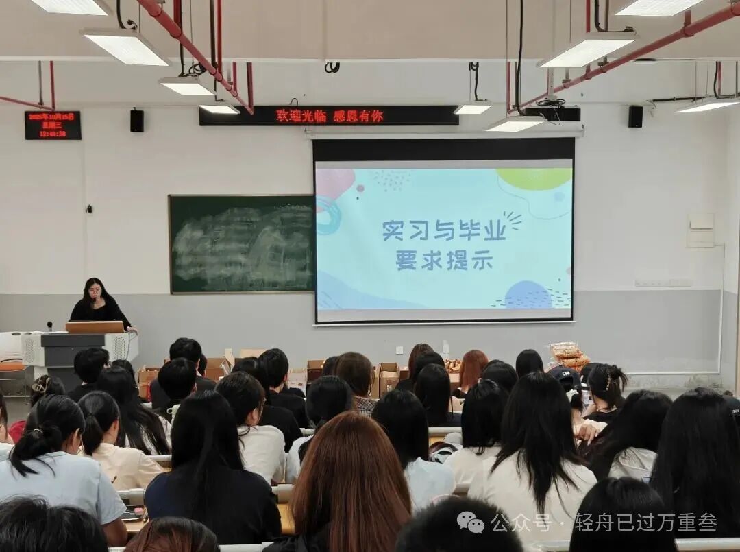 为帮助毕业班学生明晰学业要求、职业规划,顺利度过大学最后一年,2025年10月15日,辅导员黄雪燕老师以“毕业条件提示、论文撰写、实习就业指导”为核心内容开展了年级会,为即将扬帆起航的学子们送上“最后一课”的暖心护航。