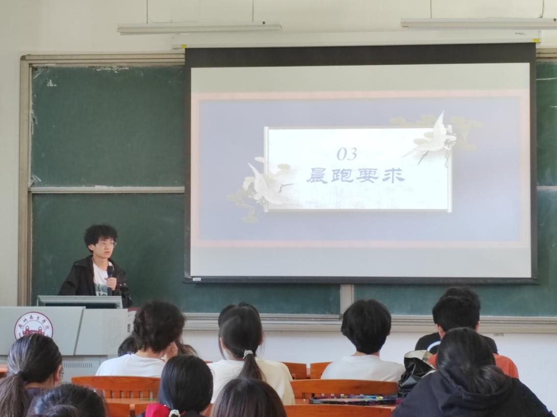 由电商3班文体委员张林锋同学向大家讲述了近来晨跑的问题和注意事项。考虑到疫情的影响,本学期学校放宽了跑步的要求,但很多同学却借此懈怠了晨跑了这一活动。本次班会强调了集体跑和自由跑关于合格与优秀的评判标准,10次自由跑+10次集体跑才算合格,而优秀的标准则需要15次自由跑+15次集体跑。放弃很简单,但坚持一定很酷,或许晨跑可以为我们的早晨赋予不一样的意义。