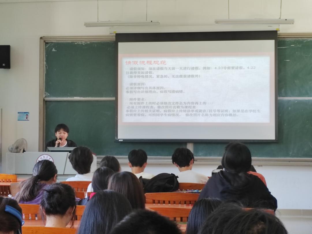 由电商1班班长周劲祥同学向大家讲述请假流程和注意细节。没有规矩不成方圆,正确的请假流程有利于学校更好地了解大家的情况,从而更好地为同学们提供具体有效的保障。