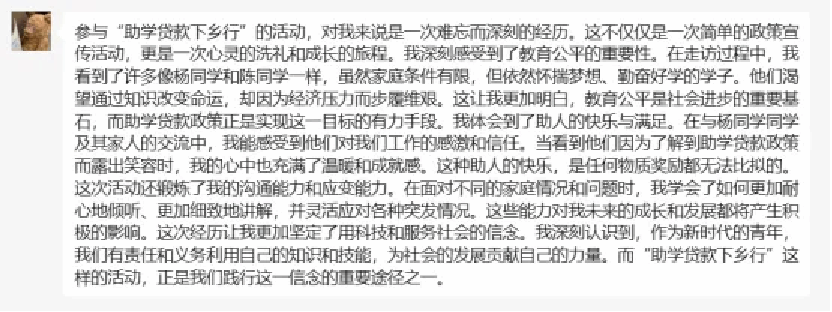 经过此次家访宣传,两位同学及其家人对国家助学贷款政策有了更加全面和深入的了解,他们纷纷表示将积极申请助学贷款,为求学之路提供有力保障。同时,此次活动也在松岭村引起了热烈反响,村民们纷纷为助学贷款政策点赞,并表示将积极向身边的亲朋好友宣传这一政策。