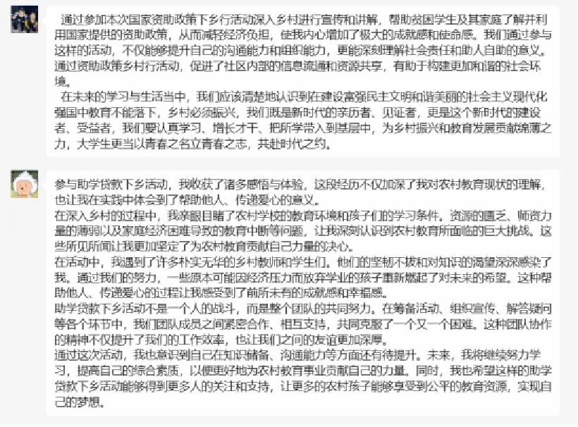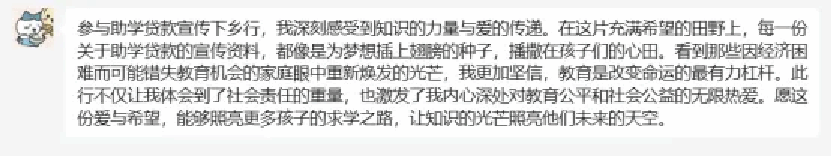 助学逐梦社会实践队下乡行实践活动已告一段落。前期调研情况,为了更好地宣传,我们团队在项目启动前集中开会培训,系统的了解了国家助学贷款政策。我们的服务内容包括宣传国家助学贷款政策、解答疑问、提供申请指导等。在服务过程中,我们发现农村地区居民对国家助学贷款政策了解较少,且申请流程较为复杂,我们的团队通过不懈努力,为当地学生解决了实际问题。首先,我们成功地宣传了国家助学贷款政策,使许多原本不了解该政策的学生和家长了解到了这一重要福利。其次,我们为有贷款需求的学生提供了申请指导,助力他们完成申请过程。