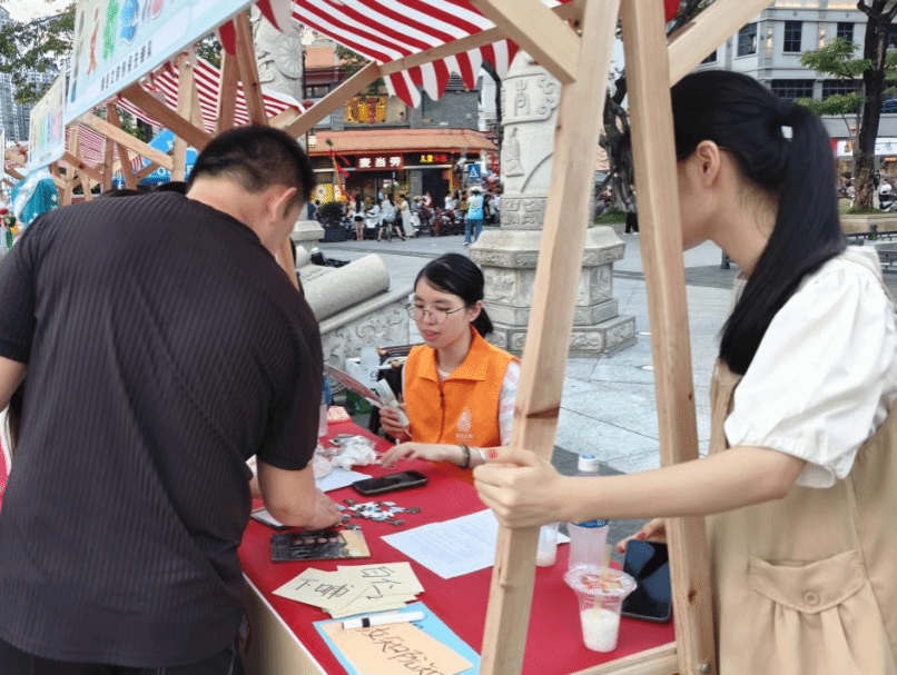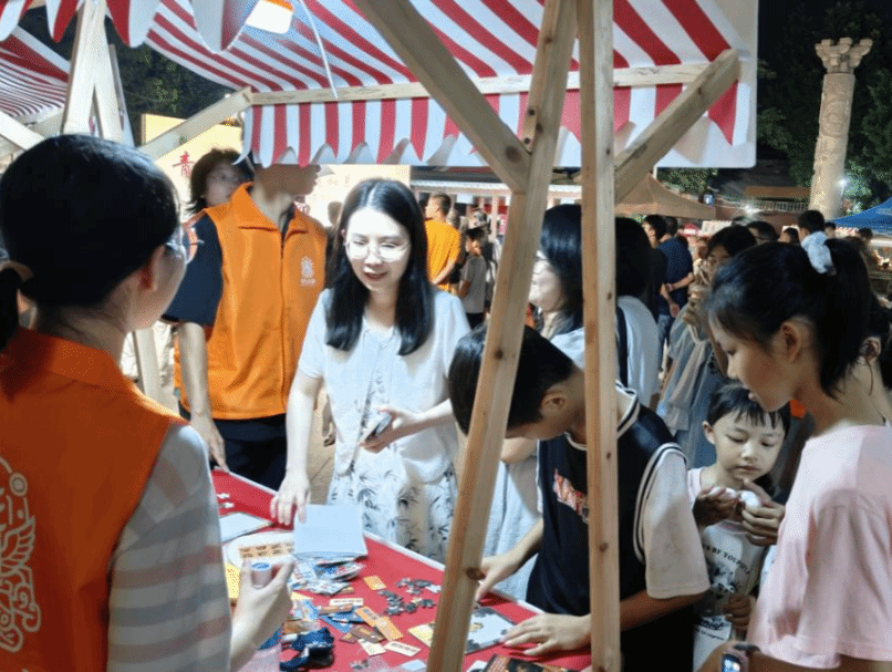 夜幕降临,学宫广场的文创义卖活动拉开帷幕。摊位前人头攒动,古城明信片上,榕城的标志性建筑在笔墨间焕发生机;古建筑图案冰箱贴则将文化韵味融入日常。“潮汕话绕口令”“拼建筑拼图” 等互动游戏更是点燃了市民的参与热情,大人小孩一同绞尽脑汁,在欢声笑语中加深了对本土文化的认知。此次义卖不仅为先锋队后续的实践活动筹集了资金,更以轻松有趣的方式让更多人感受到古城文化的魅力。