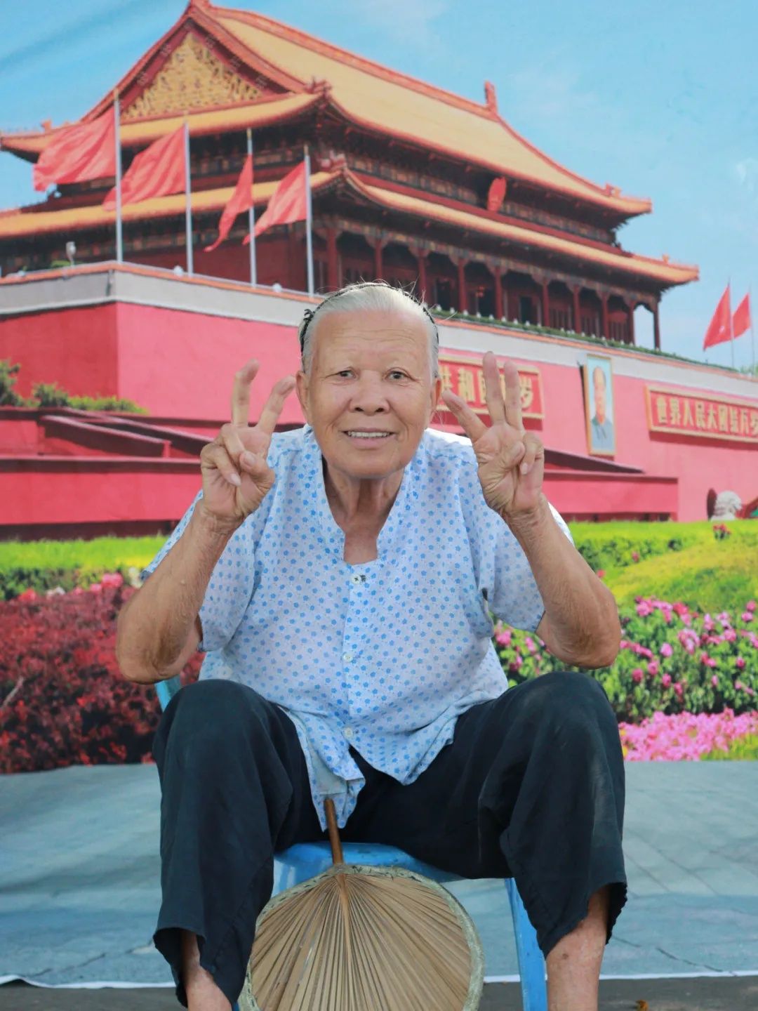 上午,队员们带着天安门画布,以天安门画布为背景定格美好瞬间,穿梭在清泰村的小巷中,寻找愿意拍照的村民。尽管遭遇了多次拒绝,但大家并未气馁,积极探讨,转变话术,先拉近距离再说明来访目的,继续挨家挨户地询问。终于,几位慈祥的老爷爷和老奶奶愿意配合,在天安门画布前留下了珍贵的合影。快门按下的瞬间,记录下他们质朴而鲜活的笑容,这些温暖的瞬间,像夏日的凉风,驱散了队员们的疲惫,也让大家深刻感受到了村民的信任与热情。
