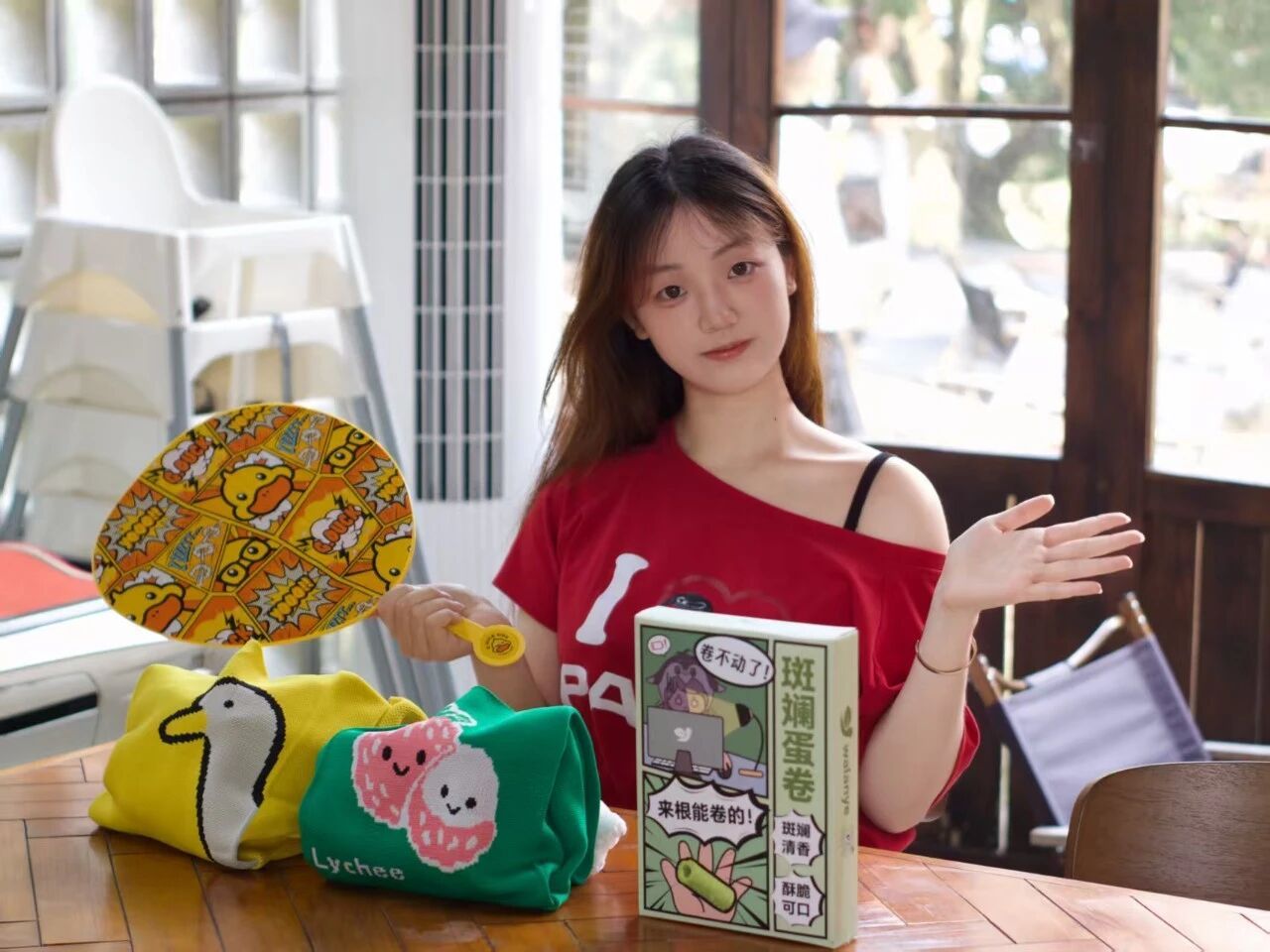 文创作品以斑斓基地的特色鸭头咖啡和荔枝为代表,推出鸭头扇子、鸭头包包、荔枝包包以及斑斓蛋卷。斑斓基地结合自身特色,通过文旅结合的方式,实现产业融合,创造性发展、创新性融合!