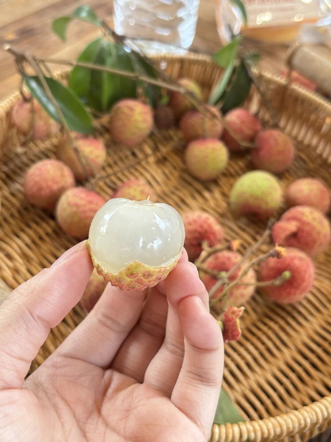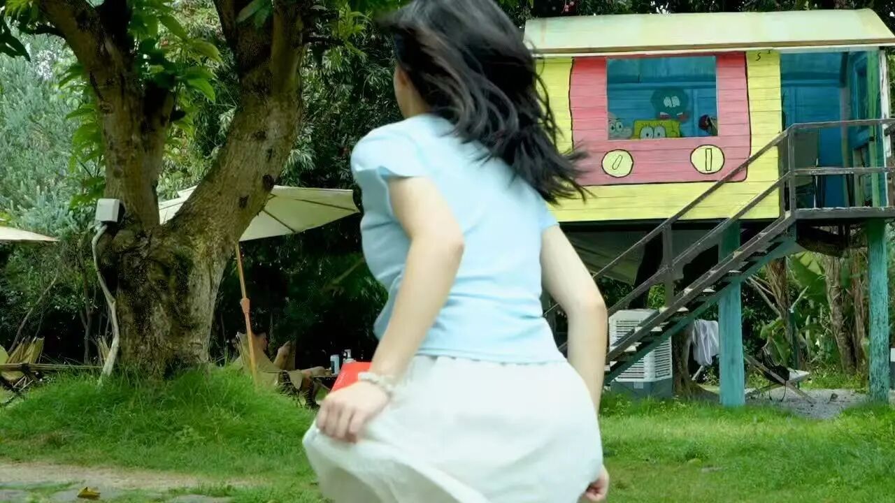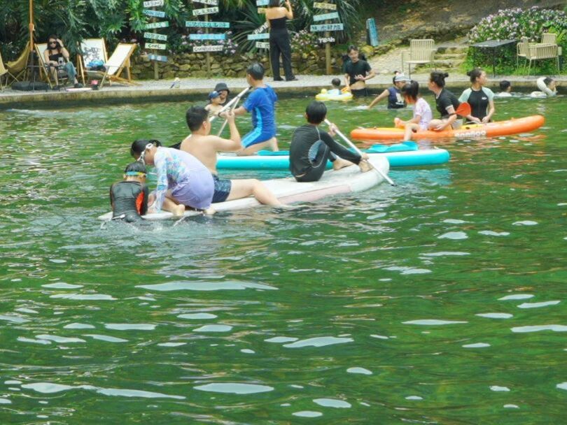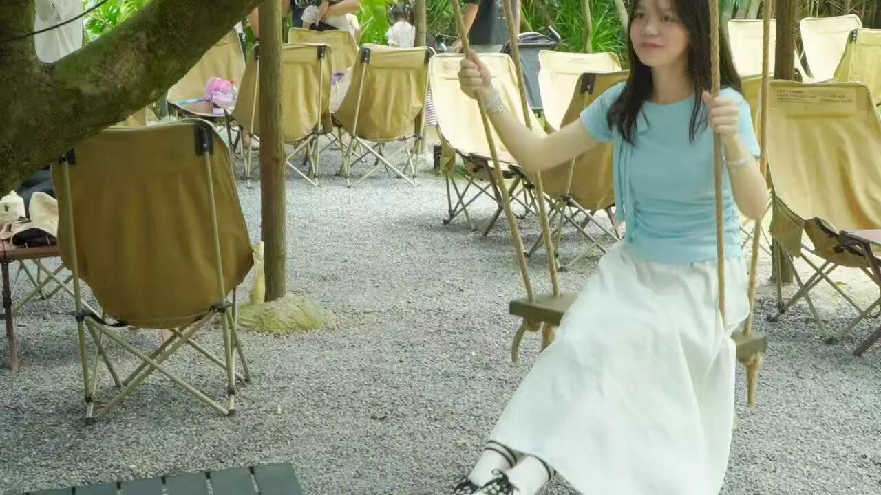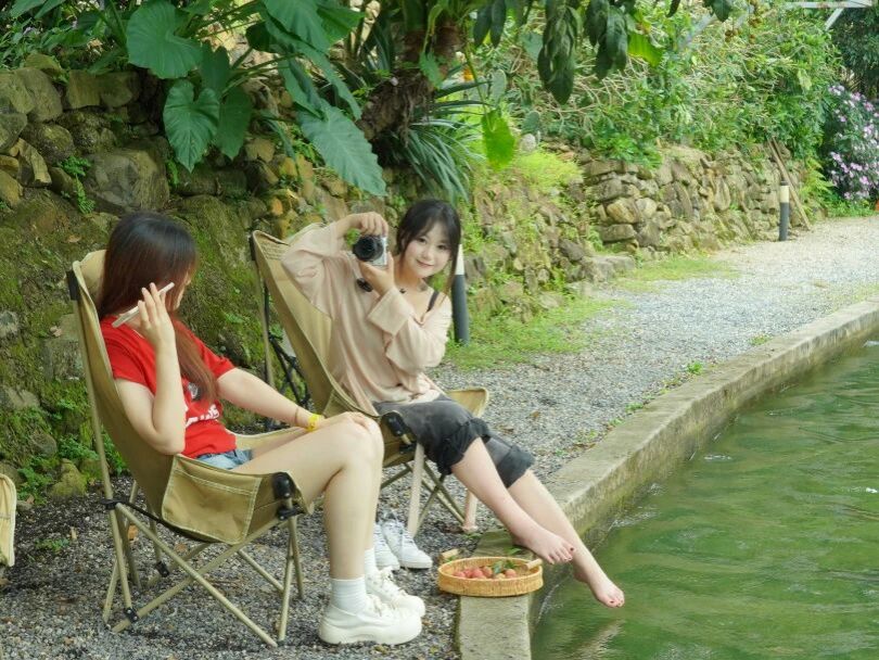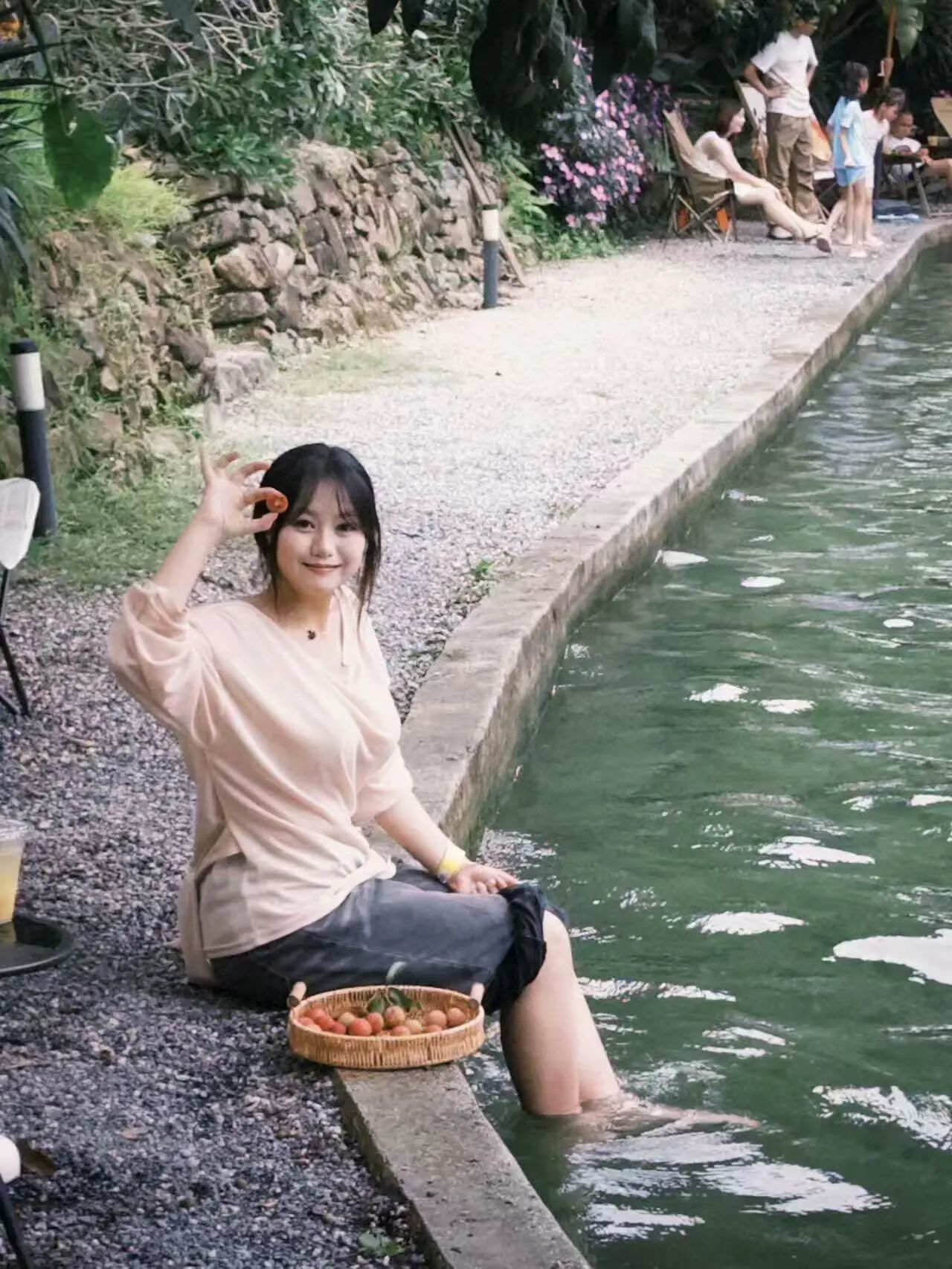 这里的泳池来自大自然,周围的荔枝树随风而舞,荔枝在枝头摇曳,空气里散发着荔枝的清香。有的人在划船嬉戏,有的人在品尝夏天的果实——西瓜,有的人赤足踩着水,泛起一圈圈涟漪,似乎在呼喊:“这里是夏天的藏宝地!”