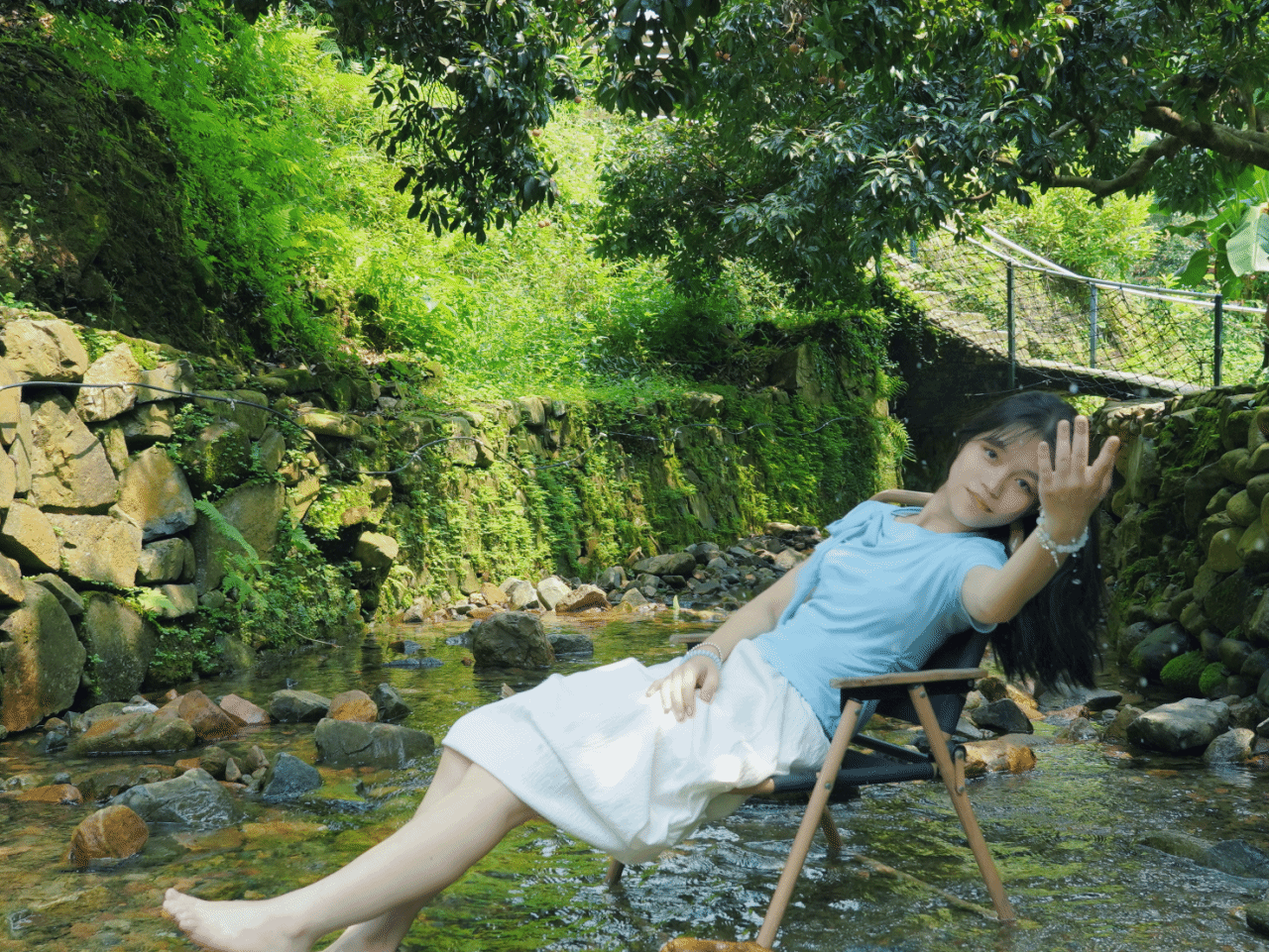 阳光温柔地抚摸着溪流,阳光的照耀使溪流泛起了黄金般的波浪,宛若小姑娘的衣裙。贪玩的小孩在溪流边踩着一个个深浅不一的脚印,大人们戴着墨镜,喝着椰汁,在溪流中漫步。影子倒映在溪流上,人们欢声笑语,似乎寻回了那年最美好的童年!