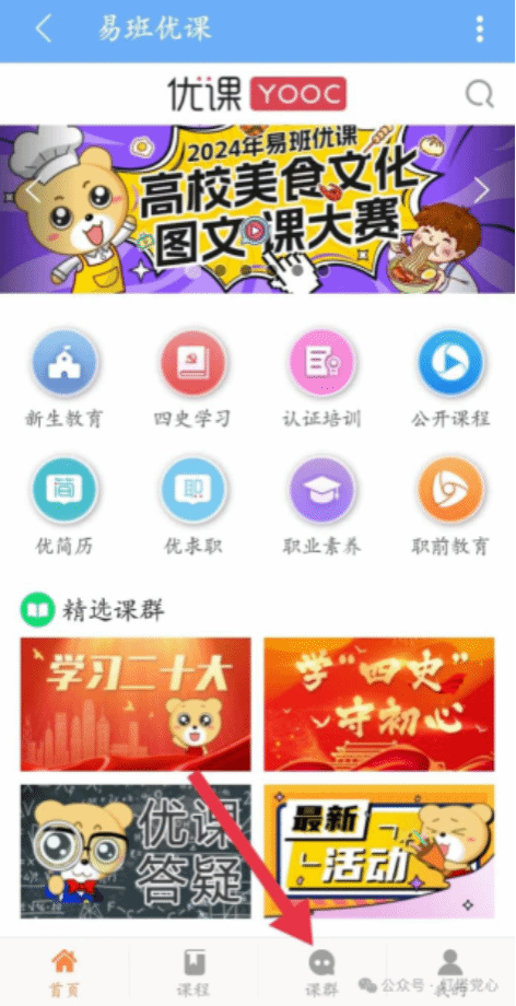 下载易班App并注册→登录进入易班→点击主页面右下角“我的”→进入个人页面后点击“易班优课”→进入优课YOOC后点击右下方“课群”进入课群主页→在课群主页中点击“添加课群”→在添加课群中搜索邀请码MQCJNUM5加入课群→加入各自对应的党支部→完成后在课群首页就可以看到线上的课程。