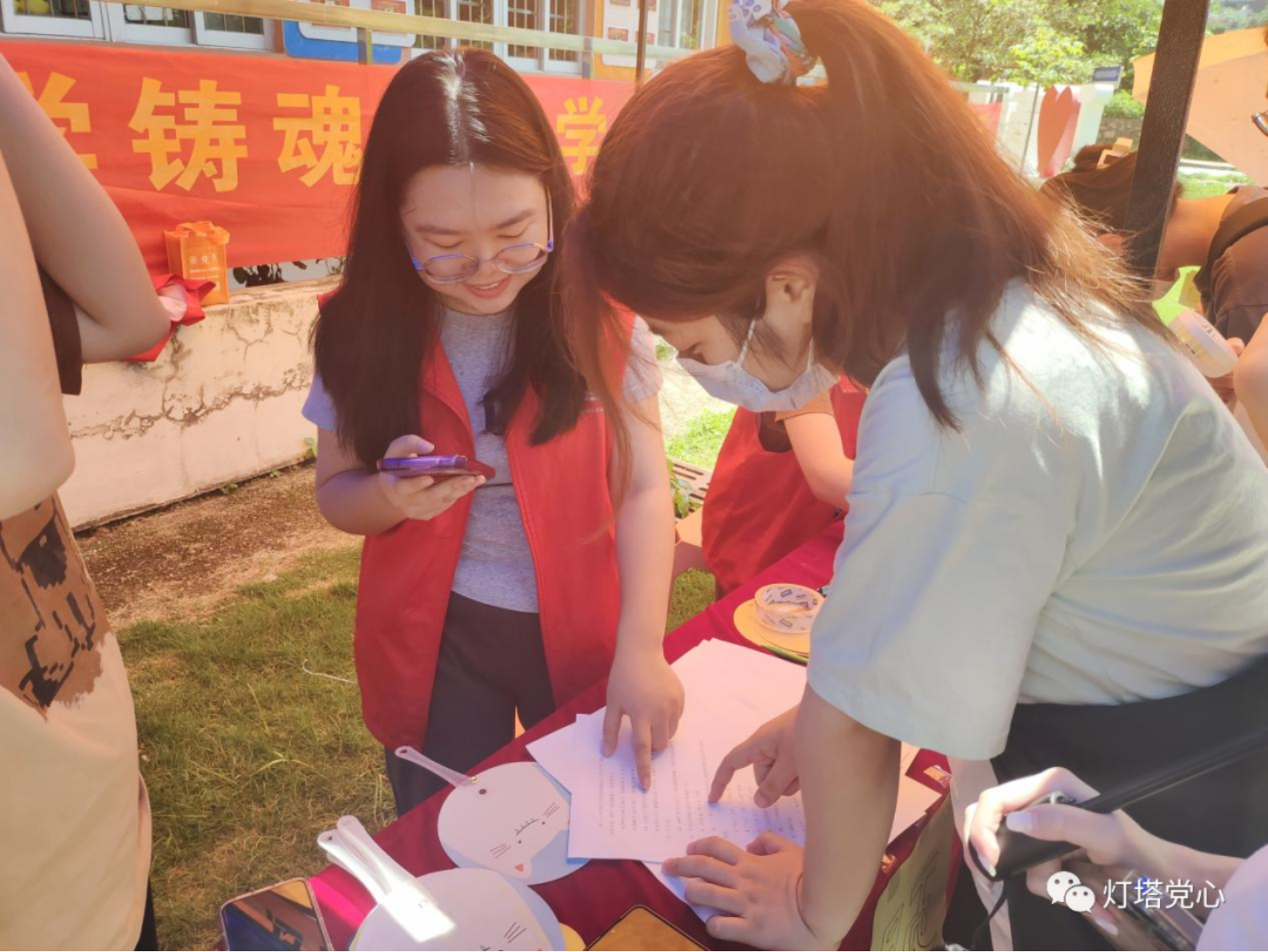 即使烈日当空,也无法阻止大家积极参与线下主题学习会的脚步,现场依旧如火如荼。此时此景,更能衬托出党的魅力,无论是在多艰难多恶劣的环境,都会坚持不懈、迎难而上,带领着人们走向胜利。同学们积极地参与线下主题学习会并鼓励身边的人加入其中,他们在各摊位前知无不言,形成了主动弥补党史空白的融洽氛围。
