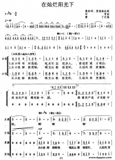 《在灿烂阳光下》全曲从“吃水不忘挖井人”唱起,讲述了中国共产党领导全国人民走过的风雨历程,赞颂了建国以来所取得的伟大成就,歌中充满了自豪和赞美。