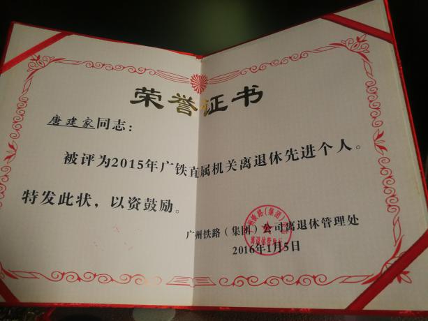 唐建家,1947年出生,1966年12月加入中国共产党,如今是一位拥有54年党龄的退休老党员。退休后,他在退休老干部处担任了8年党支部书记,发挥“领头雁”作用,曾带领党支部获得2次“先进基层党组织”荣誉称号。期间他始终不忘初心,做到退休不褪色,获得诸多荣誉,于2016年被评为“广铁直属机关离退休先进个人”。