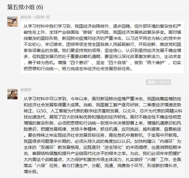 其他支部也都组织成员们以线上或线下的方式开展了党小组会议交流学习心得,在党小组会议中各位成员选取不同角度对于中国当前经济形势进行更深一步的交流与拓展,在彼此的交流和探讨中,成员们对于我国当前的经济形势有了更深刻的了解和认识。