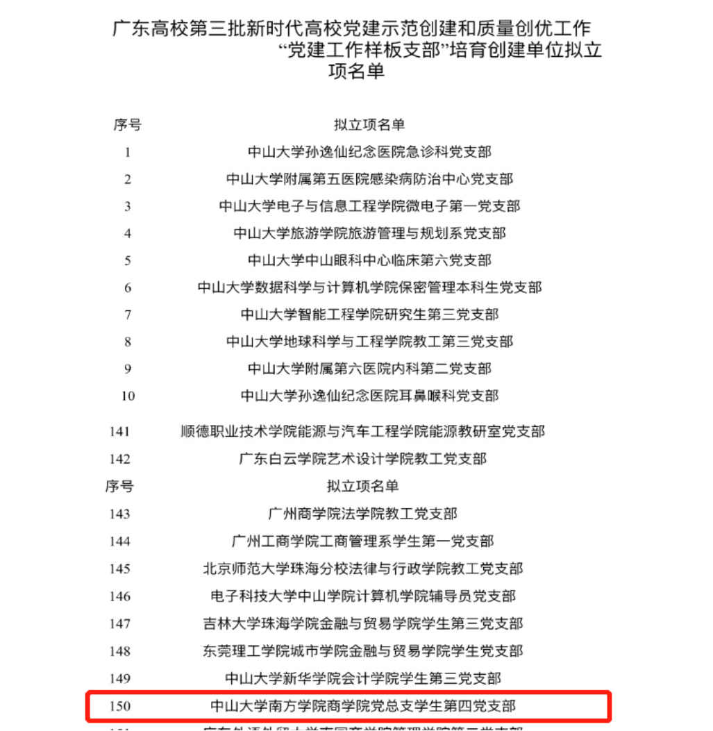 2020年12月7日,中山大学南方学院williamhill中文学生第四党支部在“广东高校第三批新时代高校党建示范创建和质量创优工作‘党建工作样板支部’培育创建单位拟立项名单”中光荣上榜。