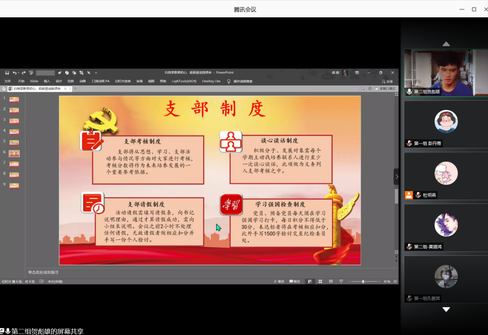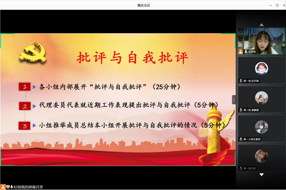 本项议程分为三个部分来进行,首先全体与会人员按学习小组名单进入到各自小组会议,展开小组内部的批判与自我批评;接着由代理委员代表就近期的工作表现做出批评与自我批评;最后各个小组代表分别打开摄像头与麦克风总结本小组开展批评与自我批评的情况。大家围绕理论学习、思想、工作与生活等方面进行了严肃的批评和自我批评,并深刻地进行自我反省。