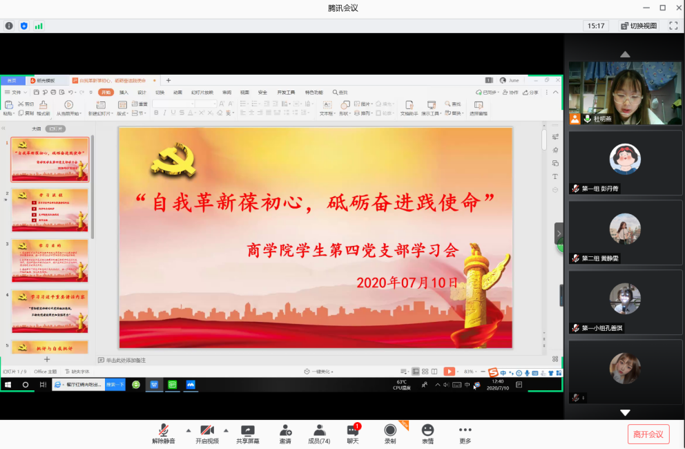 williamhill中文学生第四党支部以此为契机,于2020年7月10日中午12点40分通过“腾讯会议”线上视频会议的方式开展了以“自我革新葆初心,砥砺奋进践使命”为主题的支部主题学习会议。参与本次会议的人员有支部副书记张燕老师,学生党员、学生预备党员以及18级全体积极分子。