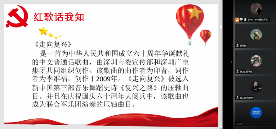 建党99周年经历的每个时期都有其代表性的主旋律红歌。工作组以十年为时段划分,挑选整理出一份建党以来的主旋律红歌歌单。听到播放的部分红歌曲段,与会成员以小组趣味比拼的形式竞猜主旋律红歌歌名,并在此基础上讲述对应时期的党史故事和歌曲创作细节,彼此分享与体悟着红歌背后动人故事。