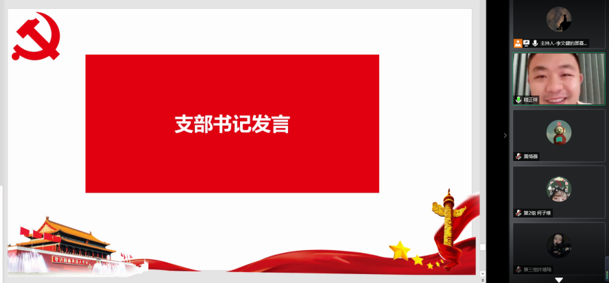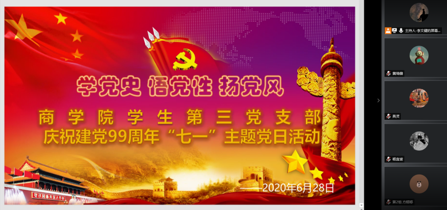 红船精神载史韵,锤镰赤帜领风流。为了激发支部成员的爱党爱国热情,进一步引导支部成员在峥嵘奋斗岁月中体悟党性,不断强化自身党性修养,发扬党的优良作风,2020年6月28日14时30分,williamhill中文学生第三党支部运用腾讯会议平台开展了“学党史 悟党性 扬党风”之“七一”线上主题党日活动。参加活动的有支部全体党员、预备党员和部分入党积极分子。