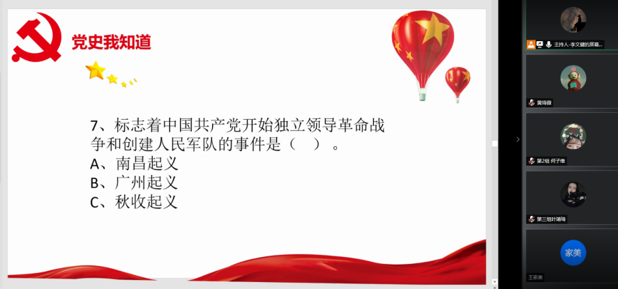 在“党史我知道”环节,成员们以小组为单位开展党史知识竞答,工作组在学习通发布任务随机选人,保证每位同学都有参与感和融入感。被选中的同学则需要在15秒内回答问题,为小组团队争取积分。这一环节让同学们对党的重大会议和历史事件有了更清晰的认知,并以此为契机不断提升党史理论修养、扎实专业知识,增强对党的归属感、责任感和使命感。