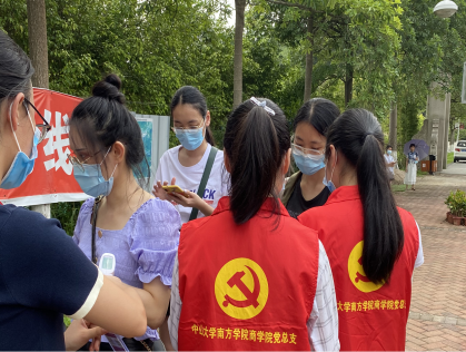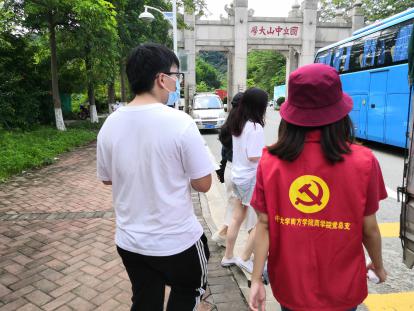 各支部的志愿者们身着醒目的红马甲,微笑着给毕业生们进行指引,不畏酷暑地为返校毕业生测量体温,协助他们搬运行李物品,耐心解答他们的返校小疑问,让返校工作井然有序地进行着。他们在炎炎烈日之下默默坚守在自己的岗位,认真履行志愿者的职责,让党旗飘扬在毕业生返校第一线,让毕业生更加感受到校园的温暖。