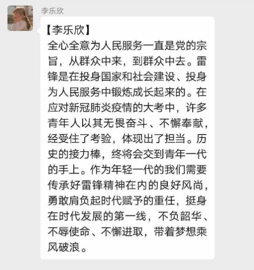 全心全意为人民服务一直是党的宗旨,从群众中来,到群众中去。雷锋是在投身国家和社会建设、投身为人民服务中锻炼成长起来的。在应对新冠肺炎疫情的大考中,许多青年人以其无畏奋斗、不懈奉献,经受住了考验,体现出了担当。历史的接力棒,终将会交到青年一代的手上。作为年轻一代的我们需要传承好雷锋精神在内的良好风尚,勇敢肩负起时代赋予的重任,挺身在时代发展的第一线,不负韶华、不辱使命、不懈进取,带着梦想乘风破浪。