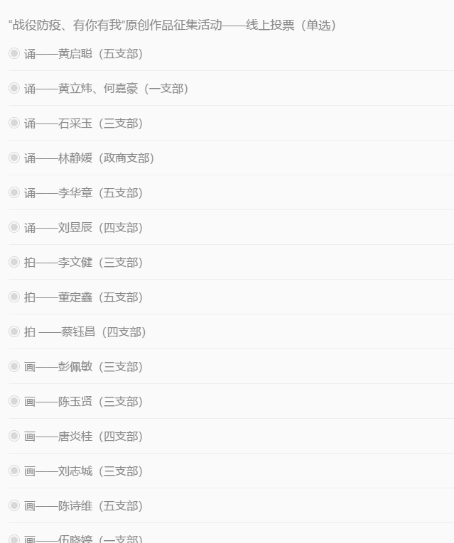 看完16份作品,你是否已经有了印象深刻,又与自己对此次疫情的表达想法不谋而合的作品呢?接下来,请大家在投票区为自己最喜爱的作品投上宝贵的一票吧(每人只能投一份作品)。