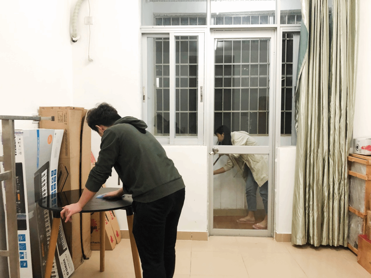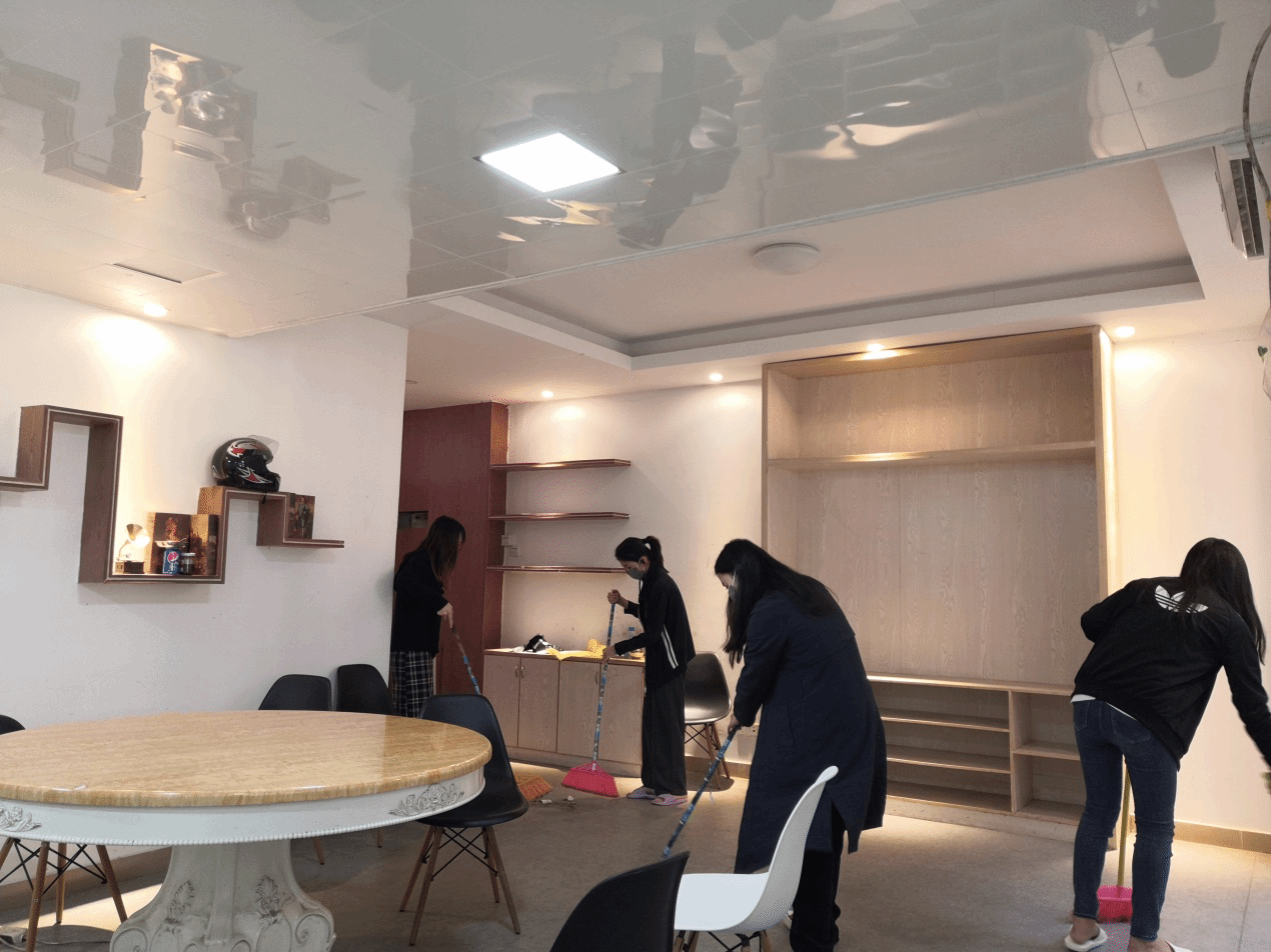“我劳动,我光荣”,志愿者队伍早已准备好了抹布、扫把等清洁工具,服务的兴致高涨,每个人的脸上都洋溢着喜悦的光芒。在小组长简单的分工后,大家各司其职,打湿抹布,细心折叠,擦去覆盖在桌面的薄薄细尘;清扫地面上的细碎纸屑,分类整理文件资料;他们在活动室里来来回回穿梭,挥洒着汗水,努力地完成繁琐细致的清洁工作。