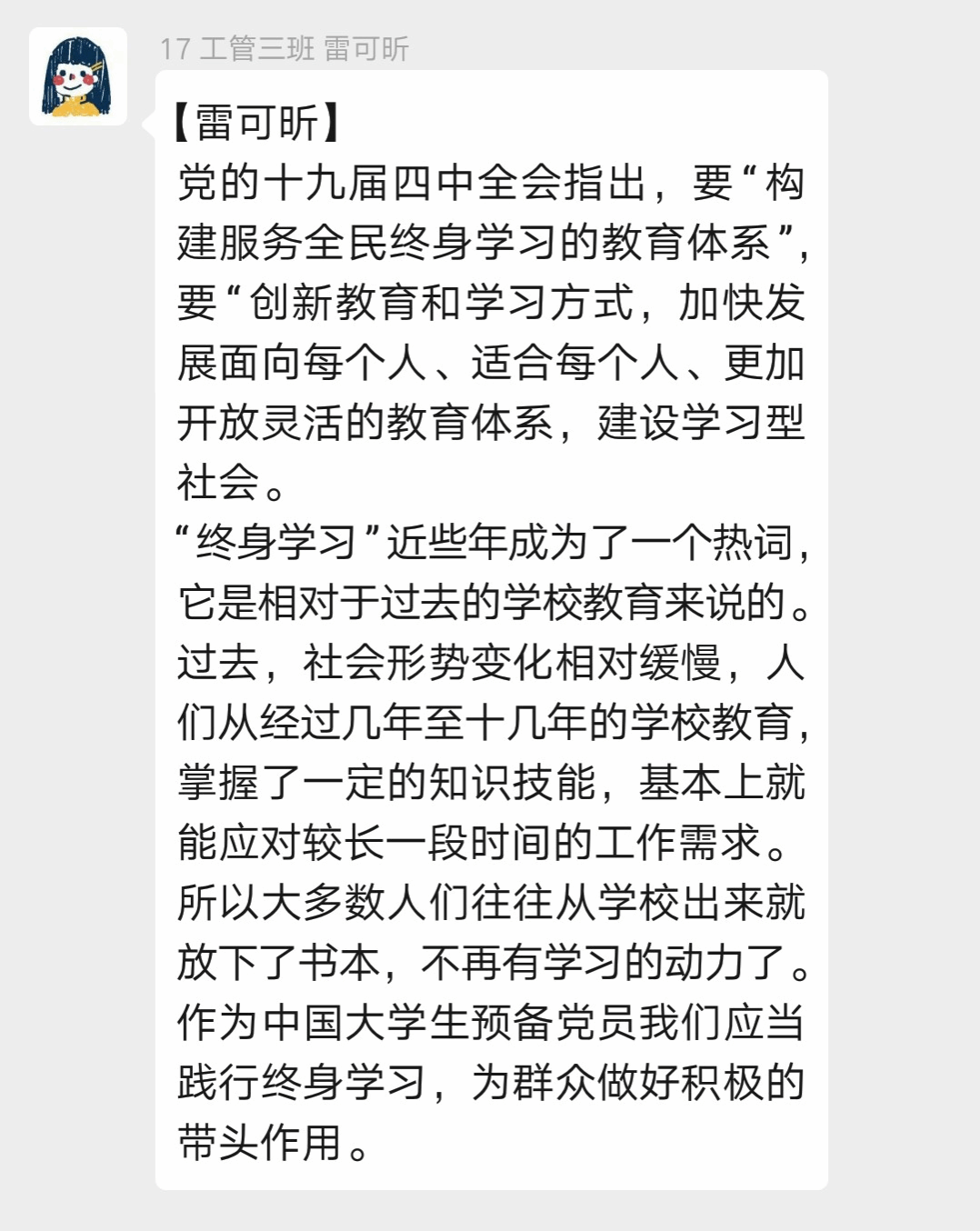 “终身学习”近些年成为了一个热词,它是相对于过去的学校教育来说的。过去,社会形势变化相对缓慢,人们从经过几年至十几年的学校教育,掌握了一定的知识技能,基本上就能应对较长一段时间的工作需求。所以大多数人们往往从学校出来就放下了书本,不再有学习的动力了。作为中国大学生预备党员我们应当践行终身学习,为群众做好积极的带头作用。