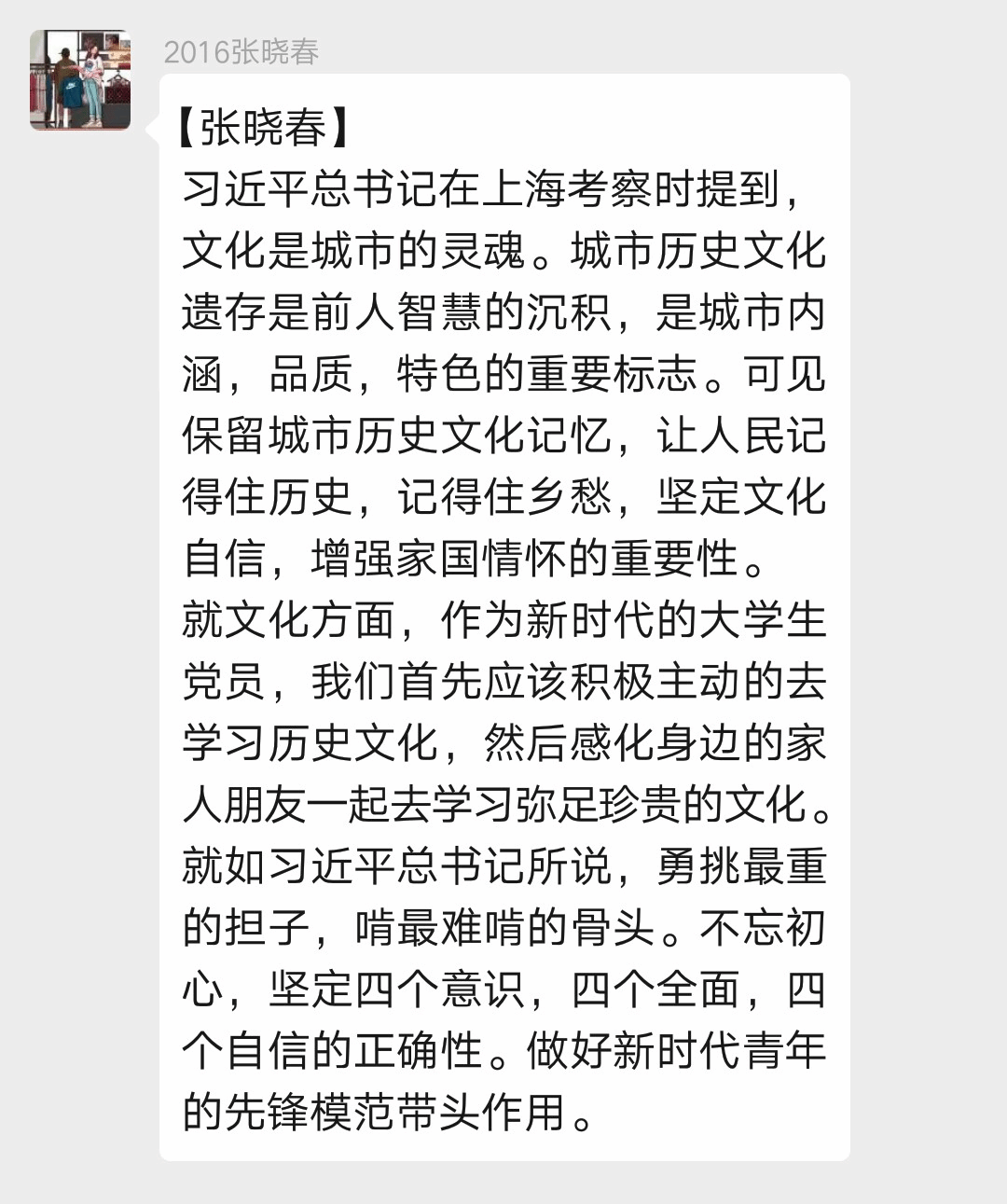 就文化方面,作为新时代的大学生党员,我们首先应该积极主动的去学习历史文化,然后感化身边的家人朋友一起去学习弥足珍贵的文化。就如习近平总书记所说,勇挑最重的担子,啃最难啃的骨头。不忘初心,坚定四个意识,四个全面,四个自信的正确性。做好新时代青年的先锋模范带头作用。