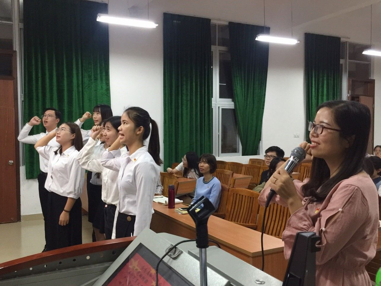 大会进行前全体起立,奏唱国际歌,场面严肃,庄严。
