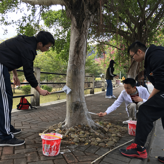 12月25日早上,支部党员和积极分子准时到达了集合点,有序领取了刷子、石灰浆、铁桶等相关工具,快速到达图书馆门前绿化区域及校园主干道区域进行“为树裹银装”工作。在专业人员的指导下,支部成员了解到冬季树木涂白的原因以及树木养护的知识。