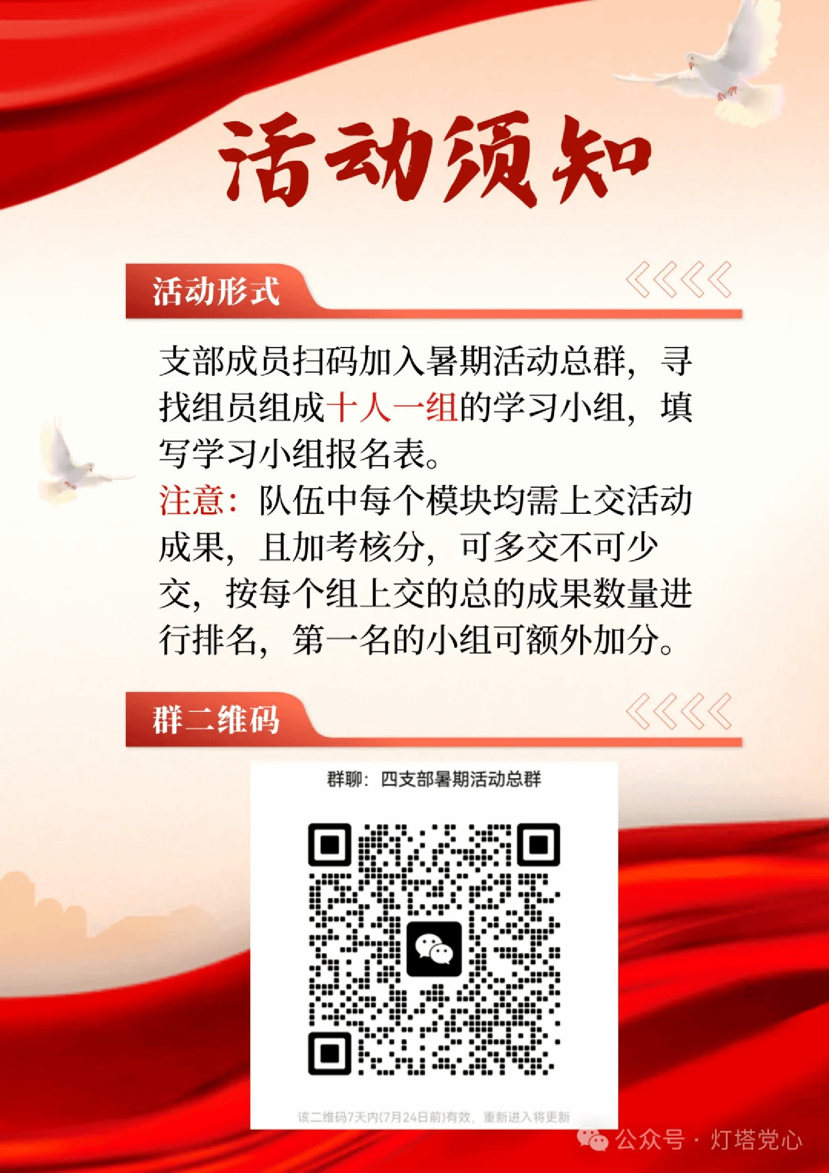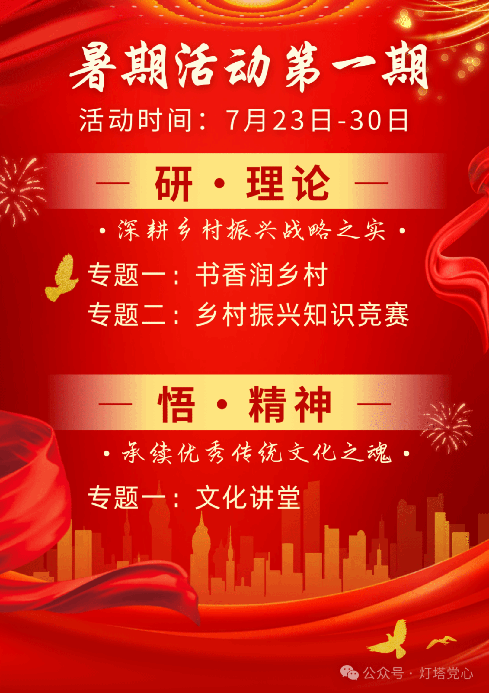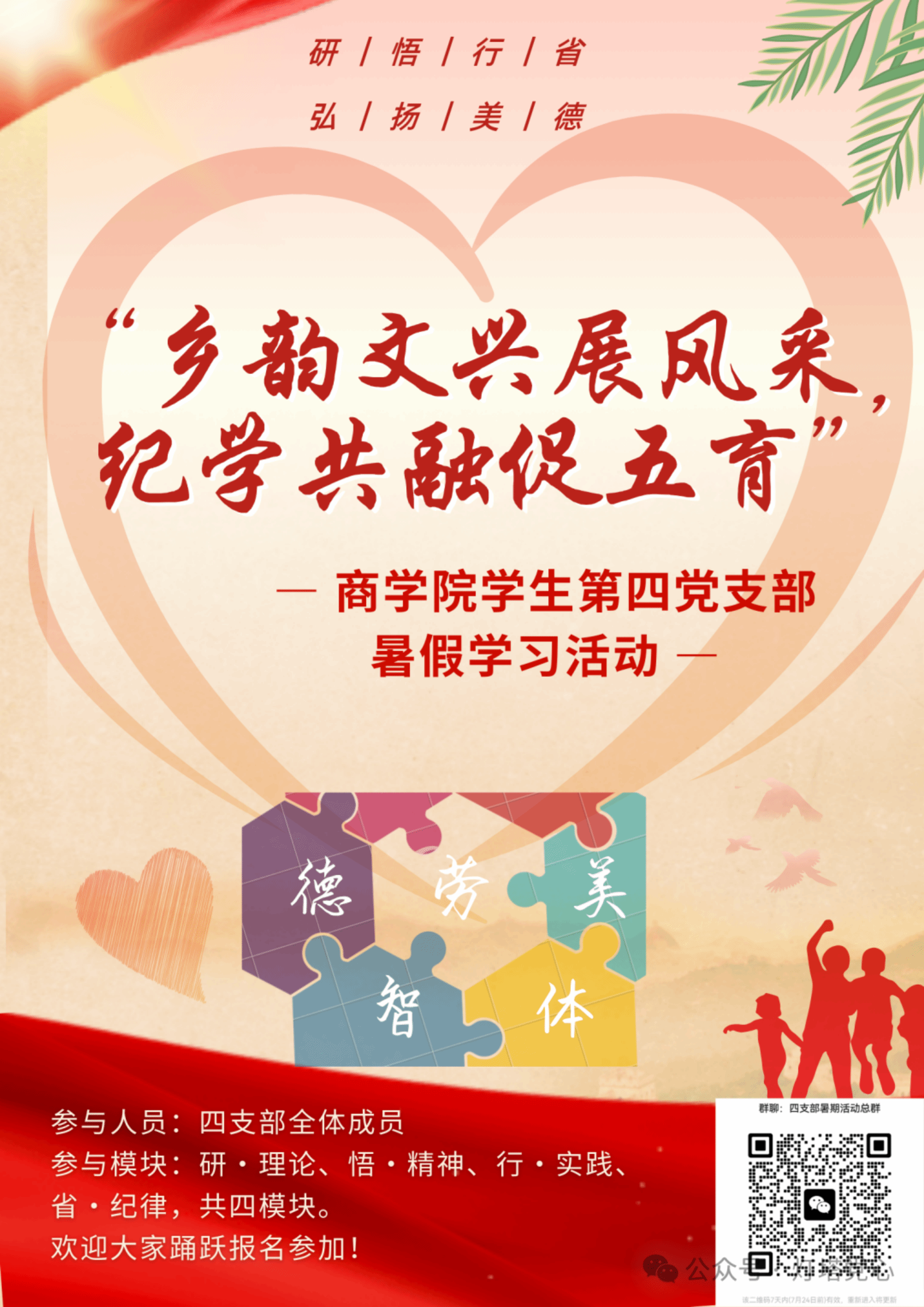 williamhill中文学生第四党支部通过本次暑假学习活动深化开展“研、悟、行、省”四字主题学习板块。“研”让我们深耕乡村振兴战略之实,“悟”让我们承续优秀传统文化之魂 ,“行”让我们以实际行动助力乡村振兴,“省”让我们以党纪党规规范自身行为。党支部成员将聚焦乡村振兴,融合“五育”之光,点亮乡村未来;通过党纪学习教育,筑牢信念基石,引领前行方向;传承中华优秀传统文化,寻根溯源,凝聚乡村精神力量;推进“百千万工程”,让乡村焕发出蓬勃的生机与活力。这个暑期,希望党支部成员们进一步强化学生党员的思想修养和党性修养,在实践中成长,在奉献中收获。