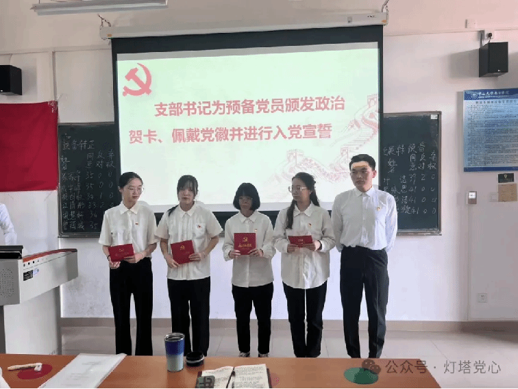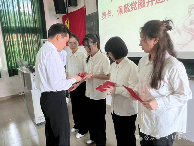 会议第三项议程,由熊新新老师为4名预备党员佩戴党员徽章并颁布政治生日贺卡。
