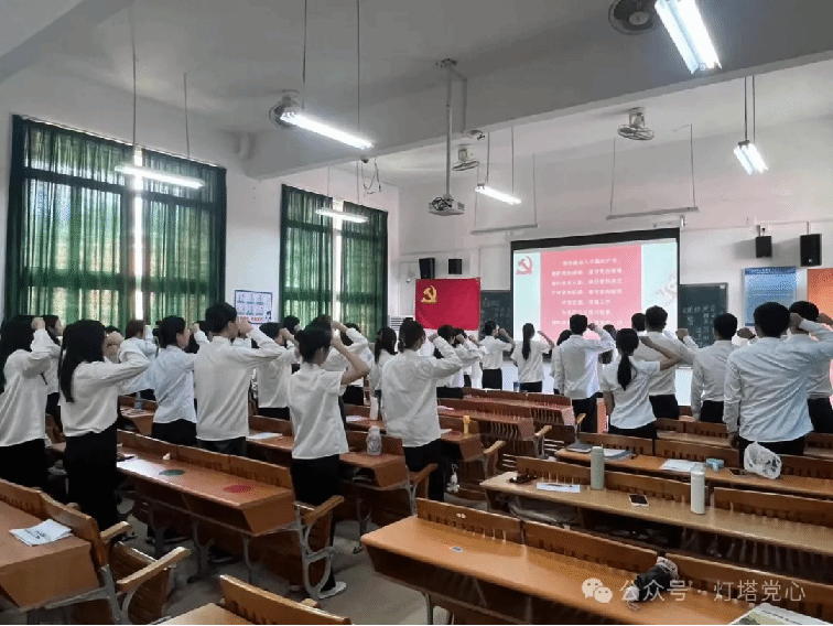 会议第二项议程,在党支部书记熊新新老师的带领下,全体同志面向鲜红的党旗右手握拳,庄严宣誓!