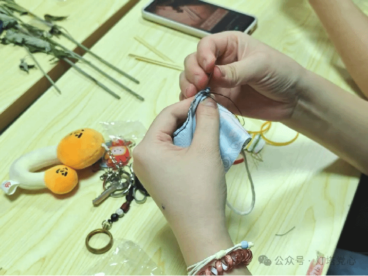 活动现场,党支部成员们分工明确,配合默契。一边将竹篾裁剪成长短大小适宜的小条,经过穿、压、挤、剪、捆等一系列动作,一支支精美秀气的竹编小船就跃然眼前。另一边穿针引线,塞入清香扑鼻的艾草香料,一个个精致小巧的艾草香囊就逐渐成形了。最后,大家将香囊挂在船底,并将艾草放在船中,艾草船就此完成。