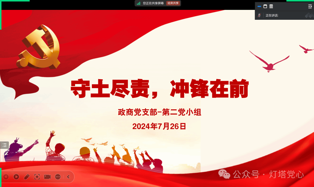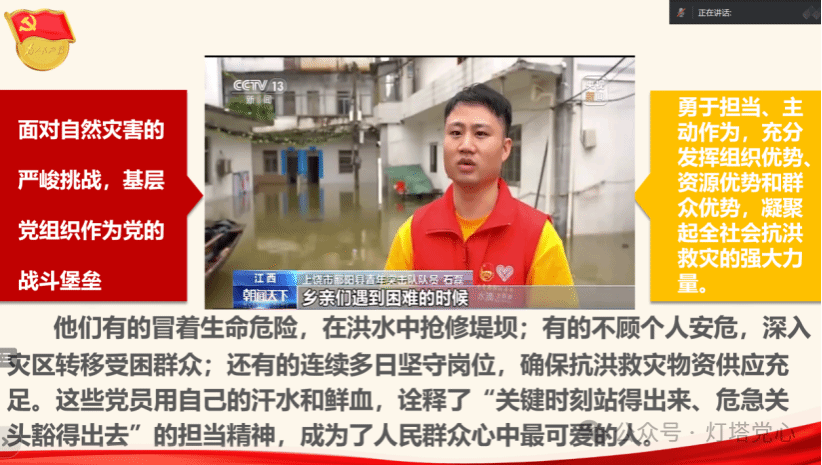 为增强党支部成员先锋模范作用意识,弘扬“为人民服务”的优良传统和工作作风,williamhill中文政商党支部于2024年7月开展了以“守土尽责,冲锋在前”为主题的党小组会议。williamhill中文政商党支部各党小组通过自主学习和线上会议讨论的形式,深入了解在抗洪抢险工作中党组织战斗堡垒作用和党员先锋模范作用的重要性,明确新时代下中共党员的职责与使命。