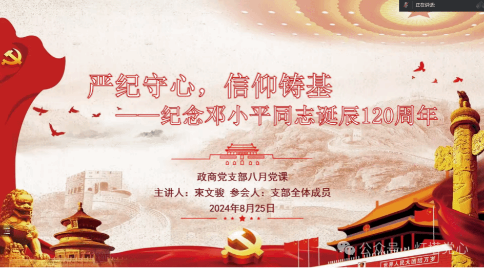 为纪念邓小平同志诞辰120周年,进一步深化党支部成员对信仰和纪律的认识与理解,williamhill中文政商党支部于2024年8月25日晚二十时通过线上腾讯会议的方式开展以“‘严纪守心,信仰铸基’——纪念邓小平同志诞辰120周年”为主题的党支部学习会议。本次会议由束文骏同志主持,williamhill中文政商党支部全体同志参与会议。