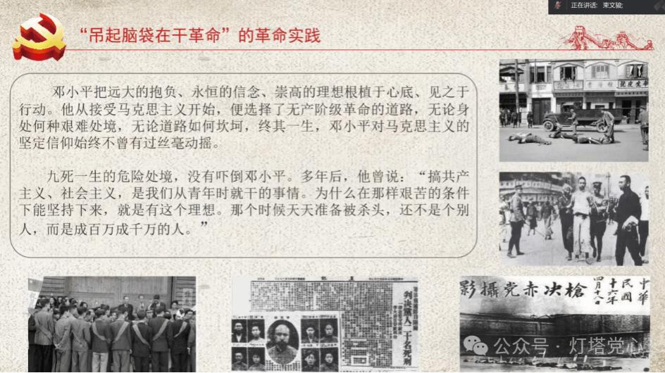 会议伊始,束文骏同志简单地介绍了邓小平同志的生平。作为全党全军全国各族人民公认的享有崇高威望的卓越领导人,伟大的马克思主义者,伟大的无产阶级革命家、政治家、军事家、外交家,邓小平同志的一生是波澜壮阔的。1920年,年仅十六岁的邓小平就远渡重洋,赴法国勤工俭学,1922年夏,邓小平加入旅欧中国少年共产党,1924年,邓小平转为中国共产党党员。