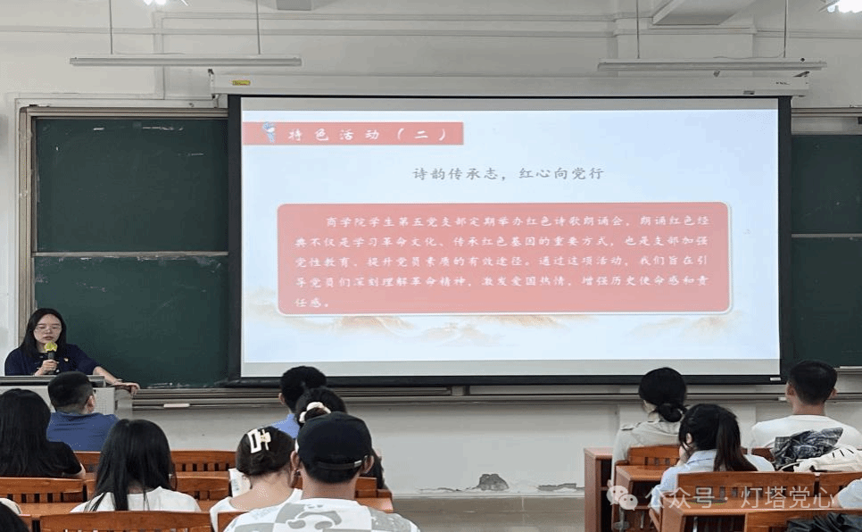 接下来,李怀厅同志提到采访老党员的党支部特色活动,在这一年里面开展了采访老党员系列活动,引导党员学先辈典型,加强党员党性修养和思想先进性,拍摄记录老党员红色故事,献礼中国共产党成立104周年。以及红韵诵心系列活动——诗歌朗诵,朗诵红色经典不仅是学习革命文化、传承红色基因的重要方式,也是党支部加强党性教育、提升党员素质的有效途径。通过这项活动,我们旨在引导党员们深刻理解革命精神,激发爱国热情,增强历史使命感和责任感。
