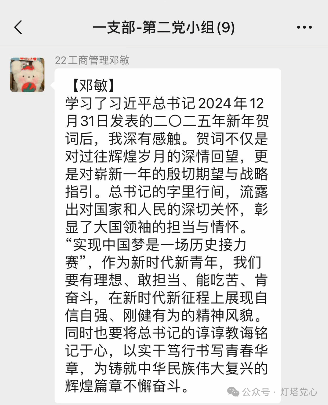 学习了习近平总书记2024年12月31日发表的二〇二五年新年贺词后,我深有感触。贺词不仅是对过往辉煌岁月的深情回望,更是对崭新一年的殷切期望与战略指引。总书记的字里行间,流露出对国家和人民的深切关怀,彰显了大国领袖的担当与情怀。“实现中国梦是一场历史接力赛”,作为新时代新青年,我们要有理想、敢担当、能吃苦、肯奋斗,在新时代新征程上展现自信自强、刚健有为的精神风貌。同时也要将总书记的谆谆教诲铭记于心,以实干笃行书写青春华章,为铸就中华民族伟大复兴的辉煌篇章不懈奋斗。