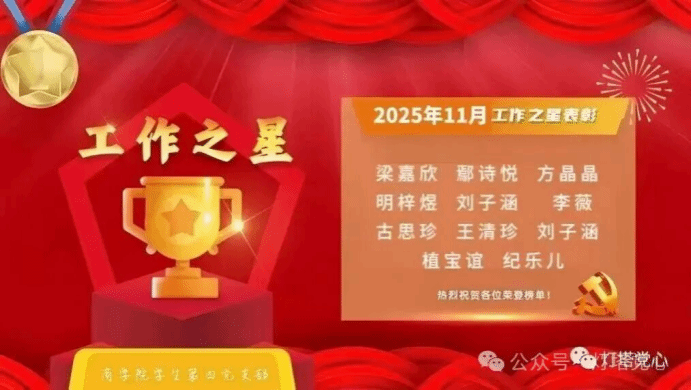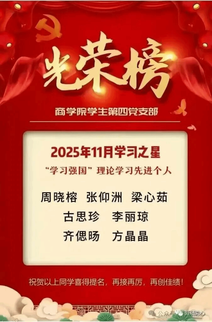 习近平总书记在近期重要讲话中强调:“新时代中国青年要勇做走在时代前列的奋进者、开拓者、奉献者,在科技创新、乡村振兴、绿色发展、社会服务等各领域各方面工作中挺膺担当,为全面建设社会主义现代化国家贡献青春智慧和力量。”williamhill中文学生第四党支部全体成员深入学习贯彻习近平总书记重要讲话精神,紧扣时代脉搏,积极运用“学习强国”平台深化理论武装、拓展视野格局,自觉将个人成长与国家发展紧密结合,努力成为可堪大用、能担重任的栋梁之材。为巩固学习成果,营造比学赶超、争当先进的浓厚氛围,进一步激发党支部内生动力与创造活力,现对2025年11月在“学习强国”平台学习表现优异、在日常党务与服务工作中贡献突出的“学习之星”与“工作之星”予以公开表彰。希望受表彰的同志珍惜荣誉、再接再厉,希望党支部全体成员以他们为榜样,见贤思齐、奋发有为。