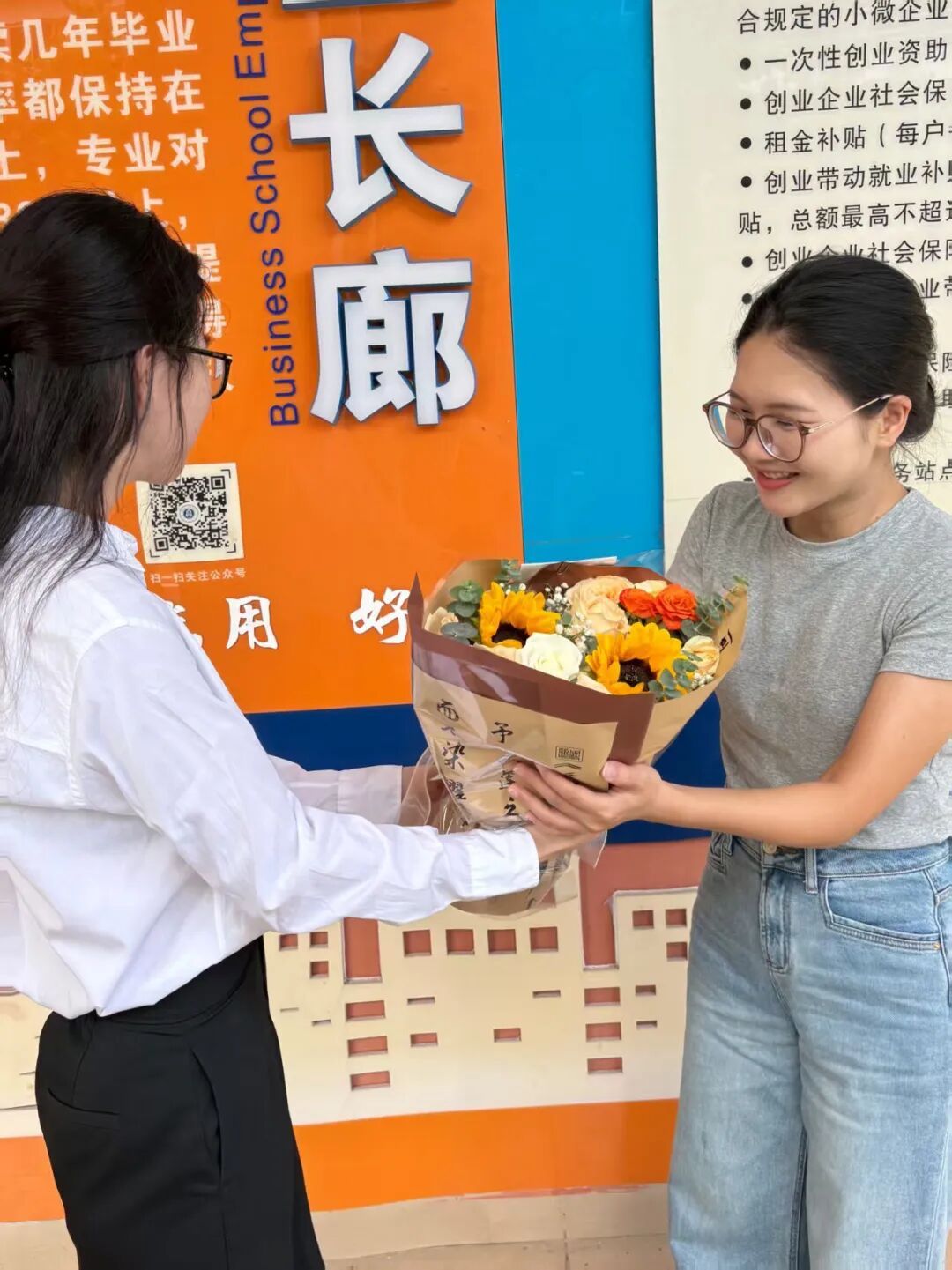 老师们看着同学们手中鲜艳的花束,眼中闪烁着惊喜与感动的光芒。一位老师激动地说:“谢谢同学们,你们的心意让我感到无比温暖。看到你们这么懂事,我觉得一切的付出都是值得的。”随后,同学们将手中的花束递给老师,并与老师亲切地合影留念。镜头前,同学们灿烂的笑容与老师们欣慰的表情交织在一起,构成了一幅最美的画面。