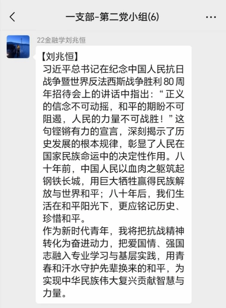 作为新时代青年,我将把抗战精神转化为奋进动力,把爱国情、强国志融入专业学习与基层实践,用青春和汗水守护先辈换来的和平,为实现中华民族伟大复兴贡献智慧与力量。