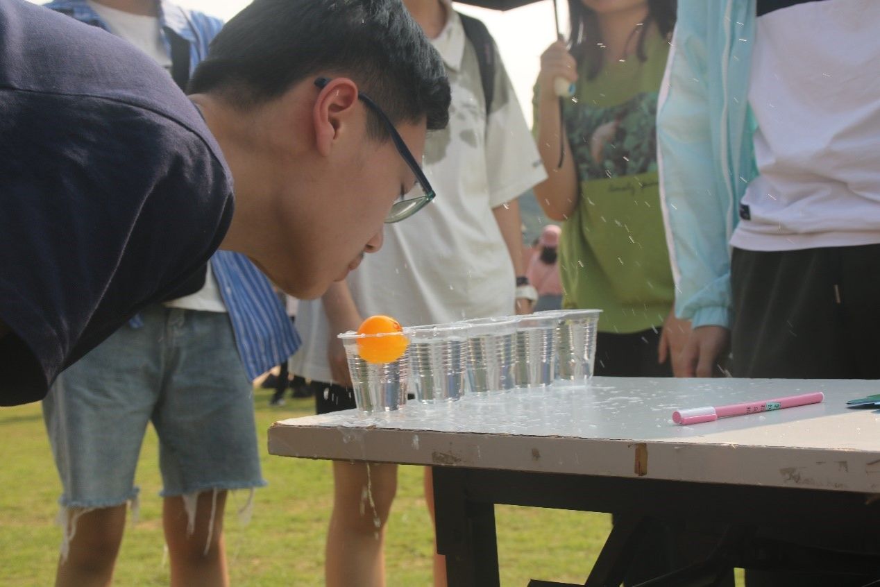 第一个人气爆棚的游戏是“水吹乒乓球”,这时候肺活量的优势就出来了,乒乓球就像轻功水上漂一样跳过一个个满水的水杯。