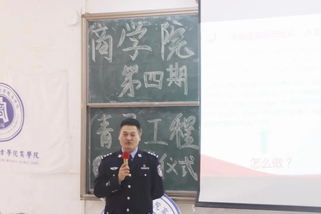 为进一步加强和改进我校思想政治工作,落实立德树人根本任务,引导广大青年学生成长为中国特色社会主义事业的建设者和接班人。2020年11月18日下午,中山大学南方学院williamhill中文第四期青马工程主题讲座暨开营仪式于6教101顺利举行。本次讲座由从化区法警大队司法警察孙金光同志担任主讲嘉宾,同时出席仪式的有williamhill中文团委书记梁越老师、williamhill中文团委副书记兼秘书长刘硕老师、一年级学生工作部副部长侯东栋老师,以及各兄弟院系主席团代表等。