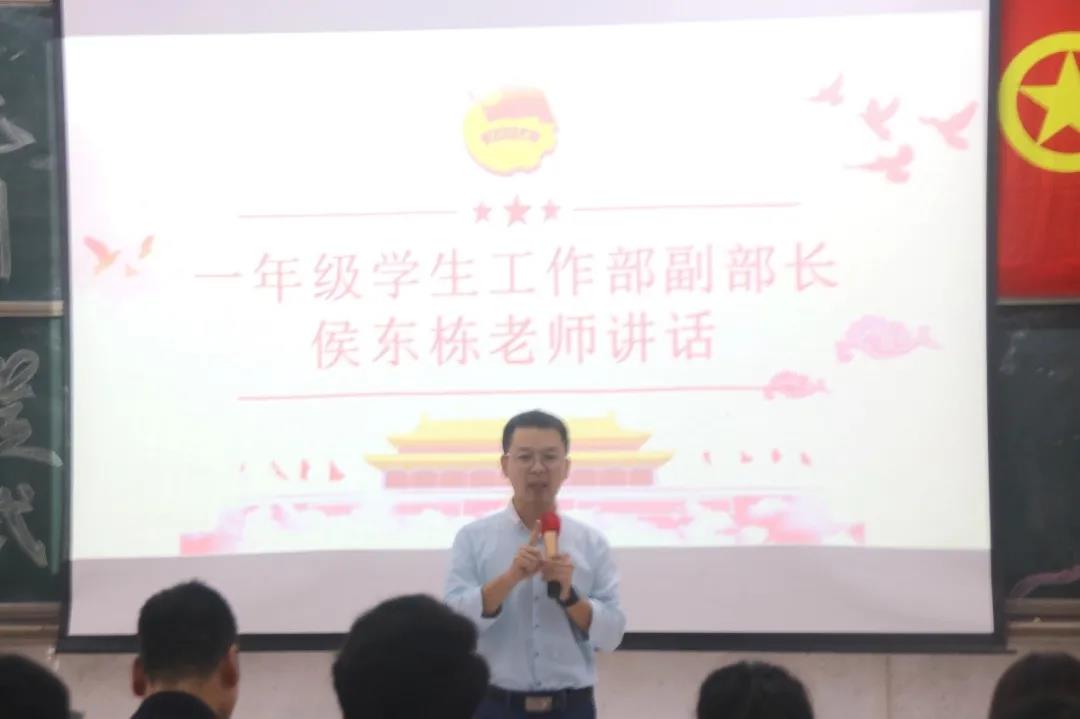 紧接着,一年级学生工作部副部长侯东栋老师致辞。首先,侯老师对此次积极参与青马工程开营仪式的同学表示热烈的欢迎并给予了叮嘱。侯老师以当今中美贸易战为例,分析了我国如今面临着如何“富起来,强起来”的问题,他强调新时代需要新青年,新青年要有新使命,在不久的将来青年一辈定将会成为各领域的领头羊,担任使命,接过时代的接力棒。他希望同学们能坚定理想信念,做时代需要的青年马克思主义者。